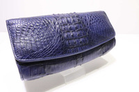 Женская сумка-клатч из натуральной, фактурной кожи крокодила темно-синего цвета. Ширина-25см, высота-13см, толщина-8см. Изделие данной модели может быть использовано и как женская плечевая сумка и как женский ручной клатч. Металлическая цепочка, звенья которой оплетены кожаным шнурком, цепочка используется в качестве плечевого ремешка и поставляется в комплекте с данным изделием. Пристегнув цепочку к сумке вы получаете плечевую сумку, отстегнув цепочку от сумки вы получаете ручной клатч. Крокодиловые клатчи данной модели отшиваются в двух размерах, в маленьком и в большом, эта большая модель. Для пошива крокодиловых сумок данной модели используется натуральная фактурная крокодиловая кожа, фактурная спинная часть шкуры крокодила. На лицевом клапане мы видим хвостовую фактуру крокодиловой кожи которая плавно перетекает на обратную часть сумки. Для придания данному клатчу максимальной подвижности и эластичности боковые вставки выполнены с применение кожи теленка, кожа теленка по цвету подобрана под цвет кожи крокодила. На лицевой части клатча устроен откидывающийся вверх лицевой клапан, в нижней части клапан фиксируется к сумке на магните. Плоская стенка делит внутренний объем клатча на два отдельных кармашка, внутри кармашков устроены отделения для карточек, одно из которых с прозрачным окошком, широкий плоский карман на молнии, карман устроен на всю ширину клатча и широкий, на всю ширину клатча плоский карман расположенный за карманом на молнии. На внутренней поверхности лицевого клапана вшиты металлический D-образные кольца для крепления съемного плечевого ремня-цепочки. В качестве материала подклада используется натуральная кожа теленка, подобранная по цвету с крокодиловой кожей и текстиль.