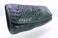 Женская сумка-клатч из натуральной, фактурной кожи крокодила темно-зеленого цвета. Ширина-25см, высота-13см, толщина-8см. Изделие данной модели может быть использовано и как женская плечевая сумка и как женский ручной клатч. Металлическая цепочка, звенья которой оплетены кожаным шнурком, цепочка используется в качестве плечевого ремешка и поставляется в комплекте с данным изделием, пристегнув цепочку к сумке вы получаете плечевую сумку, отстегнув цепочку от сумки вы получаете ручной клатч. Крокодиловые клатчи данной модели отшиваются в двух размерах, в маленьком и в большом, эта большая модель. Для пошива крокодиловых сумок данной модели используется натуральная фактурная крокодиловая кожа, фактурная спинная часть шкуры крокодила. В качестве украшения лицевой части клатча, в центральной части клапана расположена фактурная затылочная часть крокодиловой шкуры, переходящая в спинную часть на обратной стороне сумки. Для придания данному клатчу максимальной подвижности и эластичности боковые вставки выполнены с применение кожи теленка, кожа теленка по цвету подобрана под цвет кожи крокодила. На лицевой части клатча устроен откидывающийся вверх лицевой клапан, в нижней части клапан фиксируется к сумке на магните. Плоская стенка делит внутренний объем клатча на два отдельных кармашка, внутри кармашков устроены отделения для карточек, одно из которых с прозрачным окошком, широкий плоский карман на молнии, карман устроен на всю ширину клатча и широкий, на всю ширину клатча плоский карман расположенный за карманом на молнии. На внутренней поверхности лицевого клапана вшиты металлический D-образные кольца для крепления съемного плечевого ремня-цепочки. В качестве материала подклада используется натуральная кожа теленка, подобранная по цвету с крокодиловой кожей и текстиль.