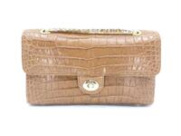 Классическая женская сумка Шанель прямоугольной формы из кожи крокодила. Для изготовления сумки данной модели использована натуральная кожа сиамского крокодила, брюшная часть, кожа высокого качества выделки, мягкая и упругая. В верхней части сумки устроен откидывающийся вверх лицевой клапан, который фиксируется на поворотный замок. Все внешние части сумки как-то, лицевой клапан, лицевая часть сумки, боковые вставки, дно и задняя часть, все эти части выполнены из брюшной части крокодиловой кожи. Брюшная часть крокодиловой кожи считается самой дорогой частью шкуры рептилии. В верхней части сумки устроен плечевой ремешок в виде цепочки оплетенной кожей теленка. Примененная на сумке фурнитура – золотого цвета. Давайте заглянем внутрь сумки и увидим что сумка делится на два объема плоским карманом на молнии.