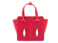 Удобная, красивая и модная современная женская сумка из натуральной кожи морского ската красного цвета. Для пошива сумок данной модели используется натуральная кожа морского ската, украшенная вертикальным глазком белого цвета. Кожа морского ската мягкая, крупнозернистая и очень приятная на ощупь. Лицевая и обратная стороны сумки выполнены с применением кожи ската и украшены вертикальными ромбовидными глазками белого цвета. На лицевой и обратной сторонах сумки устроены удобные верхние ручки, ручки выполнены из натуральной кожи теленка, кожа теленка по цвету подобрана по цвету под цвет кожи морского ската. Крепление верхних ручек к сумке выполнено с применением красивой хромированной фурнитуры. Расстояние от веха сумки до ручек – 10см. В верхней части сумки вшита металлическая молния преграждающая доступ в основной объем сумки. Слева и справа от верхней молнии, на лицевой и обратной стенке сумки вшиты D-образные металлические кольца для крепления съемного плечевого ремня. Поверхность слева и справа от верхней молнии выполнены из натуральной кожи теленка, боковые вставки сумки устроены из натуральной кожи теленка, дно сумки также выполнено из кожи теленка и оборудовано металлическими ножками, кожа теленка подобрана по цвету под цвет кожи морского ската. Плоский карман на молнии делит внутренний объем сумки на два отделения, внутри этих отделений устроены удобные карманы: сдвоенный накладной карман и на противоположной стороне боковой вшивной карман на молнии. В качестве материала подклада данной сумки из кожи морского ската использована мягкая ткань. В комплекте с сумкой идет съемный плечевой ремень с возможностью регулировки по длине, ремень выполнен из натуральной кожи теленка, кожа теленка по цвету подобрана под цвет кожи морского ската. Вес сумки данной модели примерно 750 гр.