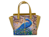 Удобная, красивая и модная современная среднеразмерная женская сумка из натуральной кожи морского ската с притом в виде павлина. При изготовлении сумок данной модели используется натуральная кожа морского ската, кожа ската мягкая, крупнозернистая и очень приятная на ощупь. Лицевая и обратная стороны сумки выполнены с применением кожи ската и украшены притом в виде павлина. На лицевой и обратной сторонах сумки устроены удобные верхние ручки, ручки выполнены из натуральной кожи теленка золотого цвета. Крепление верхних ручек к сумке выполнено с применением красивой хромированной фурнитуры. Расстояние от веха сумки до ручек – 10см. В верхней части сумки вшита металлическая молния преграждающая доступ в основной объем сумки. Слева и справа от верхней молнии, на лицевой и обратной стенке сумки вшиты D-образные металлические кольца для крепления съемного плечевого ремня. Поверхности слева и справа от верхней молнии выполнены из натуральной кожи теленка, боковые вставки дно сумки также выполнены из кожи теленка золотого цвета. Дно сумки оборудовано металлическими ножками. Плоский карман на молнии делит внутренний объем сумки на два отделения, внутри этих отделений устроены удобные карманы: сдвоенный накладной карман и на противоположной стороне боковой вшивной карман на молнии. В качестве материала подклада данной сумки из кожи морского ската использована мягкая ткань. В комплекте с сумкой идет съемный плечевой ремень с возможностью регулировки по длине, ремень выполнен из натуральной кожи теленка золотого цвета.