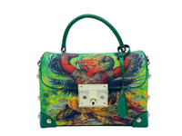 Женская сумка из натуральной кожи морского ската выполненная в стиле сумок GUCCI, зеленоватого цвета с принтом в виде мифического божества Гаруда. Для пошива сумок данной модели используется натуральная кожа морского ската, кожа высокого качества выделки и окраса. Кожа ската крупнозернистая и очень приятная на ощупь. Сумка прямоугольной формы, каркасная, прекрасно держит форму. В верхней части сумки на лицевой поверхности расположен лицевой клапан. Лицевой клапан откидывается вверх, в нижней части лицевого клапана устроена ответная часть от крупноразмерного металлического замка золотого цвета, расположенного на лицевой поверхности сумки ниже лицевого клапана. В верхней части сумки устроена удобная, объемная верхняя ручка. Крепление ручек сумки выполнено с применением металлических колец, расположенных в верхней части лицевого клапана. Ручка изготовлена из натуральной кожи теленка, расстояние от верха сумки до ручки- 9см.На верхней ручке, с одной стороны прикреплен декоративный шнурок из кожи теленка, к нижней части шнурка прикреплен ключик для открывания крупного замка, устроенного на лицевой части сумки. Лицевая часть сумки, лицевой клапан сумки, обратная сторона сумки выполнены из натуральной кожи морского ската и украшены принтом зеленого цвета с силуэтом мифического бога Гаруда. Лицевая и обратная часть сумки выполнены с припуском на боковые вставки сумки. В качестве дополнительного украшения сумки да боковых поверхностях выполнены металлический заклепки золотого цвета. Вся фурнитура, использованная для пошива сумок данной модели выполнена в золотом цвете. На боковых поверхностях сумки вшиты металлические кольца для крепления съемного плечевого ремня. Съемный плечевой ремень изготовленный из кожи теленка, с возможностью регулировки по длине идет в комплекте с сумкой. В качестве дополнительного украшения сумки, на лицевой и обратной стороне, в нижних углах устроены декоративные вставки округлой формы. Дно сумки выполнено из кожи теленка и на дне сумки устроены четыре металлических ножки. Сумка из кожи морского ската данной модели внутри выполнена в одном объеме, для большего комфорта пользования сумкой внутри устроены плоские накладные карманы. Карманы отшиты на всю ширину сумки. В качестве материала подклада сумки используется натуральная кожа теленка, подобранная под цвет кожи морского ската и текстиль.
