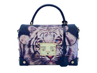 Женская сумка из натуральной кожи морского ската выполненная в стиле сумок GUCCI, с принтом в виде морды тигра. Для пошива сумок данной модели используется натуральная кожа морского ската, кожа высокого качества выделки и окраса. Кожа ската крупнозернистая и очень приятная на ощупь. Сумка прямоугольной формы, каркасная, прекрасно держит форму. В верхней части сумки на лицевой поверхности расположен лицевой клапан. Лицевой клапан откидывается вверх, в нижней части лицевого клапана устроена ответная часть от крупноразмерного металлического замка золотого цвета, расположенного на лицевой поверхности сумки ниже лицевого клапана. В верхней части сумки устроена удобная, объемная верхняя ручка. Крепление ручек сумки выполнено с применением металлических колец, расположенных в верхней части лицевого клапана. Ручка изготовлена из натуральной кожи теленка, расстояние от верха сумки до ручки- 9см.На верхней ручке, с одной стороны прикреплен декоративный шнурок из кожи теленка, к нижней части шнурка прикреплен ключик для открывания крупного замка, устроенного на лицевой части сумки. Лицевая часть сумки, лицевой клапан сумки, обратная сторона сумки выполнены из натуральной кожи морского ската и украшены разноцветным принтом. Лицевая и обратная часть сумки выполнены с припуском на боковые вставки сумки. В качестве дополнительного украшения сумки да боковых поверхностях выполнены металлический заклепки золотого цвета. Вся фурнитура, использованная для пошива сумок данной модели выполнена в золотом цвете. На боковых поверхностях сумки вшиты металлические кольца для крепления съемного плечевого ремня. Съемный плечевой ремень изготовленный из кожи теленка, с возможностью регулировки по длине идет в комплекте с сумкой. В качестве дополнительного украшения сумки, на лицевой и обратной стороне, в нижних углах устроены декоративные вставки округлой формы. Дно сумки выполнено из кожи теленка и на дне сумки устроены четыре металлических ножки. Сумка из кожи морского ската данной модели внутри выполнена в одном объеме, для большего комфорта пользования сумкой внутри устроены плоские накладные карманы. Карманы отшиты на всю ширину сумки. В качестве материала подклада сумки используется натуральная кожа теленка, подобранная под цвет кожи морского ската и текстиль.