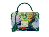 Женская сумка из натуральной кожи морского ската выполненная в стиле сумок GUCCI, зеленоватого цвета с принтом в виде павлина. Для пошива сумок данной модели используется натуральная кожа морского ската, кожа высокого качества выделки и окраса. Кожа ската крупнозернистая и очень приятная на ощупь. Сумка прямоугольной формы, каркасная, прекрасно держит форму. В верхней части сумки на лицевой поверхности расположен лицевой клапан. Лицевой клапан откидывается вверх, в нижней части лицевого клапана устроена ответная часть от крупноразмерного металлического замка золотого цвета, расположенного на лицевой поверхности сумки ниже лицевого клапана. В верхней части сумки устроена удобная, объемная верхняя ручка. Крепление ручек сумки выполнено с применением металлических колец, расположенных в верхней части лицевого клапана. Ручка изготовлена из натуральной кожи теленка, расстояние от верха сумки до ручки- 9см.На верхней ручке, с одной стороны прикреплен декоративный шнурок из кожи теленка, к нижней части шнурка прикреплен ключик для открывания крупного замка, устроенного на лицевой части сумки. Лицевая часть сумки, лицевой клапан сумки, обратная сторона сумки выполнены из натуральной кожи морского ската и украшены разноцветным принтом. Лицевая и обратная часть сумки выполнены с припуском на боковые вставки сумки. В качестве дополнительного украшения сумки да боковых поверхностях выполнены металлический заклепки золотого цвета. Вся фурнитура, использованная для пошива сумок данной модели выполнена в золотом цвете. На боковых поверхностях сумки вшиты металлические кольца для крепления съемного плечевого ремня. Съемный плечевой ремень изготовленный из кожи теленка, с возможностью регулировки по длине идет в комплекте с сумкой. В качестве дополнительного украшения сумки, на лицевой и обратной стороне, в нижних углах устроены декоративные вставки округлой формы. Дно сумки выполнено из кожи теленка и на дне сумки устроены четыре металлических ножки. Сумка из кожи морского ската данной модели внутри выполнена в одном объеме, для большего комфорта пользования сумкой внутри устроены плоские накладные карманы. Карманы отшиты на всю ширину сумки. В качестве материала подклада сумки используется натуральная кожа теленка, подобранная под цвет кожи морского ската и текстиль.