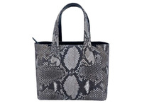 Удобная вместительная женская сумка из натуральной питоновой кожи натурального окраса, спинная часть. Сумки данной модели понравятся тем из вас, кто отдает предпочтение удобным сумкам среднего размера с повышенным функционалом. Давайте рассмотрим данную сумку более детально: Сумка из питоновой кожи трапециевидной формы с небольшим расширением к верху сумки. Сумка не имеет определенной лицевой стороны и поэтому данную сумку из кожи питона можно носить как в левой, так и в правой руке и этой питоновой сумкой с одинаковым удобством и комфортом могут пользоваться как правши, так и левши. В верхней части сумки вшита металлическая молния преграждающая доступ в основной объем сумки. Поверхности слева и справа от молнии выполнены в коже теленка черного цвета. Сумка данной модели спроектирована и отшита с двумя очень удобными карманами, доступ в эти карманы устроен слева и справа от верхней молнии. Карманы выполнены на всю ширину сумки и на 2/3 глубины сумки. Для того чтобы получить доступ в карман необходимо потянуть за верхнюю ручку в сторону от сумки. Если потянуть обе ручки одновременно в разные стороны, то передняя и задняя поверхности сумки отклонятся в стороны от сумки, и вы получите доступ в оба кармана. Если вернуть поверхности сумки обратно, они закрепятся на металлических магнитных кнопках, и сумка вернется в исходное положение. Верхняя молния сумки выполнены с выпуском хвостика молнии, что позволяет, при полностью открытой молнии, получить более широкий и комфортный доступ во внутренний объем сумки. Верхние ручки сумки широкие, удобные и комфортные. Расстояние от верха сумки до ручек 18см что позволяет носить данную питоновую сумку как в руке, так и на предплечье. Ручки сумки выполнены на основании из натуральной кожи теленка черного цвета, и их внешняя поверхность имеет отделку кожей питона. Боковые вставки сумки также выполнены из натуральной кожи питона. Дно сумки выполнено из кожи теленка черного цвета, на дне сумки расположены 4 металлических ножки. В верхней части сумки вшиты металлические кольца для крепления съемного плечевого ремня. Плечевой ремень выполнен на основании кожи теленка черного цвета, и внешняя часть плечевого ремня имеет отделку кожей питона. На плечевом ремне установлено металлическое кольцо, позволяющее выполнять регулировку ремня по длине. Сумка внутри выполнена в одном объеме, что для среднеразмерных сумок довольно разумное решение. Для большего удобства пользования сумкой внутри устроены удобные карманы такие как: сдвоенный накладной карман и на противоположной стороне сумки боковой карман на молнии, вокруг молнии этого кармана выполнена декоративная вставки из кожи теленка черного цвета. Подклад сумки комбинирован из кожи теленка и ткани. Мягкий текстиль и кожа теленка удачно сочетаются в качестве материала подклада, применение текстиля позволяет снизить вес сумки и сделать стоимость питоновой сумки более демократичной и доступной.