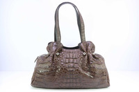 Женская крокодиловая сумка с длинными ручками, сумка из фактурной спинной части шкуры крокодила коричневого цвета. Ширина-37см, ширина в верхней части сумки -22см, высота- 17см, толщина-15см, расстояние от верха сумки до ручек-25см. Для пошива сумок данной модели используется натуральная фактурная часть кожи крокодила. Главным украшением сумки является крупная, фактурная затылочная часть крокодиловой шкуры, затылок расположен на лицевой поверхности сумки. Обратная часть сумки выполнена с применением крокодиловой кожи со спинной фактурой. Боковые части сумки и частично дно сумки выполнено с применение крокодиловой кожи. Дополнительным украшением сумки является элемент крепления ручек сумки, ручки сумки крепятся с применением декоративной металлической хромированной булавки с красивыми шариками на концах. На дне сумки устроены металлические ножки. Дно сумки выполнено частично из крокодиловой кожи и частично из кожи теленка. Верхние ручки сумки выполнены достаточно длинными, расстояние от верха сумки до верха ручек 25см, что позволяет носить данную сумку как в руках, так и на предплечье, а в некоторых случаях и на плече. Ручки сумки выполнены на основании из кожи теленка, внешняя часть ручек сумки имеет отделку кожей крокодила. Внутри сумка устроена очень интересно: в верхней части сумки, по центру вшита металлическая молния преграждающая доступ в основной объем сумки, слева и справа от молнии устроены вставки из крокодиловой кожи. Слева и справа от крокодиловых вставок выполнены широкие удобные карманы для предметов первой необходимости, карманы выполнены на всю ширину сумки и на всю глубину, в верхней части карманы фиксируются на скрытые магниты. Внутри сумка выполнена в одном объеме, для дополнительного удобства пользования внутри сумки устроены удобные карманы для повседневных предметов первой необходимости, боковой сдвоенный накладной и на противоположной стороне вшивной карман на молнии. В качестве материала подклада использована натуральная кожа теленка, цвет кожи теленка подобран под цвет кожи крокодила. Необходимо отдельно отметить что крокодиловые сумки данной модели не укомплектованы плечевым ремнем и кольцами для крепления плечевого ремня.
