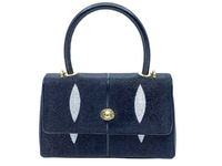 Женская сумка в стиле Chanel из натуральной кожи морского ската черного цвета. Для пошива сумок данной модели используется шесть шкурок морского ската, кожа ската крупнозернистая, высокого качества выделки и окраса. Окрашивание кожи ската выполнено классическим образом, с выделением центральной спинной части шкурки вертикальным ромбовидным глазком белого цвета. На лицевой части сумки мы видим откидывающийся вверх лицевой клапан, клапан украшен двумя вертикальными белыми глазками, в нижней части клапан фиксируется к сумке на поворотную застежку золотого цвета, в верхней части устроена удобная ручка. Ручка выполнена из натуральной кожи теленка, кожа теленка подобрана по цвету под кожу морского ската. Слева и справа в местах крепления верхней ручки устроены металлические кольца для крепления съемного плечевого ремня. Обратная сторона сумки выполнена с применением кожи ската и украшена двумя белыми ромбообразными глазками, в верхней части на обратной стороне сумки устроен удобный плоский карман, карман выполнен на всю ширину сумки. На лицевой части сумки, под лицевым клапаном, выполнена вставка из кожи морского ската, лицевая часть дополнительно украшена парой белых вертикальных ромбовидных глазков. Боковые вставки сумки выполнены с применением натуральной кожи теленка, дно сумки также выполнено из кожи теленка, на дне сумки устроены металлические ножки. Плоский карман на молнии делит внутренний объем сумки на два отделения. Для повешения удобства пользования сумкой с кожи ската внутри сумки устроены карманы: боковой карман на молнии и боковой карман плоский карман. В комплекте с сумкой поставляется плечевой ремешок, плечевой ремешок выполнен из цепочки золотого цвета, для повышения комфортности пользования сумкой центральная вставка на плечевом ремешке выполнена из кожи теленка. В качестве материала подклада сумки из кожи морского ската используется текстиль и натуральная кожа теленка, кожа теленка по цвету подобрана под цвет кожи морского ската. Сумка данной модели является популярной и отшивается в различных цветах как из кожи морского ската, так и из крокодиловой кожи.
