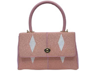 Женская сумка в стиле Chanel из натуральной кожи морского ската цвета сакура. Для пошива сумок данной модели используется шесть шкурок морского ската, кожа ската крупнозернистая, высокого качества выделки и окраса. Окрашивание кожи ската выполнено классическим образом, с выделением центральной спинной части шкурки вертикальным ромбовидным глазком белого цвета. На лицевой части сумки мы видим откидывающийся вверх лицевой клапан, клапан украшен двумя вертикальными белыми глазками, в нижней части клапан фиксируется к сумке на поворотную застежку золотого цвета, в верхней части устроена удобная ручка. Ручка выполнена из натуральной кожи теленка, кожа теленка подобрана по цвету под кожу морского ската. Слева и справа в местах крепления верхней ручки устроены металлические кольца для крепления съемного плечевого ремня. Обратная сторона сумки выполнена с применением кожи ската и украшена двумя белыми ромбообразными глазками, в верхней части на обратной стороне сумки устроен удобный плоский карман, карман выполнен на всю ширину сумки. На лицевой части сумки, под лицевым клапаном, выполнена вставка из кожи морского ската, лицевая часть дополнительно украшена парой белых вертикальных ромбовидных глазков. Боковые вставки сумки выполнены с применением натуральной кожи теленка, дно сумки также выполнено из кожи теленка, на дне сумки устроены металлические ножки. Плоский карман на молнии делит внутренний объем сумки на два отделения. Для повешения удобства пользования сумкой с кожи ската внутри сумки устроены карманы: боковой карман на молнии и боковой карман плоский карман. В комплекте с сумкой поставляется плечевой ремешок, плечевой ремешок выполнен из цепочки золотого цвета, для повышения комфортности пользования сумкой центральная вставка на плечевом ремешке выполнена из кожи теленка. В качестве материала подклада сумки из кожи морского ската используется текстиль и натуральная кожа теленка, кожа теленка по цвету подобрана под цвет кожи морского ската. Сумка данной модели является популярной и отшивается в различных цветах как из кожи морского ската, так и из крокодиловой кожи.