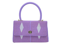Женская сумка в стиле Chanel из натуральной кожи морского ската сиреневого цвета. Для пошива сумок данной модели используется шесть шкурок морского ската, кожа ската крупнозернистая, высокого качества выделки и окраса. Окрашивание кожи ската выполнено классическим образом, с выделением центральной спинной части шкурки вертикальным ромбовидным глазком белого цвета. На лицевой части сумки мы видим откидывающийся вверх лицевой клапан, клапан украшен двумя вертикальными белыми глазками, в нижней части клапан фиксируется к сумке на поворотную застежку золотого цвета, в верхней части устроена удобная ручка. Ручка выполнена из натуральной кожи теленка, кожа теленка подобрана по цвету под кожу морского ската. Слева и справа в местах крепления верхней ручки устроены металлические кольца для крепления съемного плечевого ремня. Обратная сторона сумки выполнена с применением кожи ската и украшена двумя белыми ромбообразными глазками, в верхней части на обратной стороне сумки устроен удобный плоский карман, карман выполнен на всю ширину сумки. На лицевой части сумки, под лицевым клапаном, выполнена вставка из кожи морского ската, лицевая часть дополнительно украшена парой белых вертикальных ромбовидных глазков. Боковые вставки сумки выполнены с применением натуральной кожи теленка, дно сумки также выполнено из кожи теленка, на дне сумки устроены металлические ножки. Плоский карман на молнии делит внутренний объем сумки на два отделения. Для повешения удобства пользования сумкой с кожи ската внутри сумки устроены карманы: боковой карман на молнии и боковой карман плоский карман. В комплекте с сумкой поставляется плечевой ремешок, плечевой ремешок выполнен из цепочки золотого цвета, для повышения комфортности пользования сумкой центральная вставка на плечевом ремешке выполнена из кожи теленка. В качестве материала подклада сумки из кожи морского ската используется текстиль и натуральная кожа теленка, кожа теленка по цвету подобрана под цвет кожи морского ската. Сумка данной модели является популярной и отшивается в различных цветах как из кожи морского ската, так и из крокодиловой кожи.
