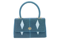 Женская сумка в стиле Chanel из натуральной кожи морского ската темно-зеленого цвета. Для пошива сумок данной модели используется шесть шкурок морского ската, кожа ската крупнозернистая, высокого качества выделки и окраса. Окрашивание кожи ската выполнено классическим образом, с выделением центральной спинной части шкурки вертикальным ромбовидным глазком белого цвета. На лицевой части сумки мы видим откидывающийся вверх лицевой клапан, клапан украшен двумя вертикальными белыми глазками, в нижней части клапан фиксируется к сумке на поворотную застежку золотого цвета, в верхней части устроена удобная ручка. Ручка выполнена из натуральной кожи теленка, кожа теленка подобрана по цвету под кожу морского ската. Слева и справа в местах крепления верхней ручки устроены металлические кольца для крепления съемного плечевого ремня. Обратная сторона сумки выполнена с применением кожи ската и украшена двумя белыми ромбообразными глазками, в верхней части на обратной стороне сумки устроен удобный плоский карман, карман выполнен на всю ширину сумки. На лицевой части сумки, под лицевым клапаном, выполнена вставка из кожи морского ската, лицевая часть дополнительно украшена парой белых вертикальных ромбовидных глазков. Боковые вставки сумки выполнены с применением натуральной кожи теленка, дно сумки также выполнено из кожи теленка, на дне сумки устроены металлические ножки. Плоский карман на молнии делит внутренний объем сумки на два отделения. Для повешения удобства пользования сумкой с кожи ската внутри сумки устроены карманы: боковой карман на молнии и боковой карман плоский карман. В комплекте с сумкой поставляется плечевой ремешок, плечевой ремешок выполнен из цепочки золотого цвета, для повышения комфортности пользования сумкой центральная вставка на плечевом ремешке выполнена из кожи теленка. В качестве материала подклада сумки из кожи морского ската используется текстиль и натуральная кожа теленка, кожа теленка по цвету подобрана под цвет кожи морского ската. Сумка данной модели является популярной и отшивается в различных цветах как из кожи морского ската, так и из крокодиловой кожи.