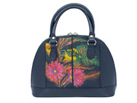 Сумка женская из натуральной кожи морского ската, сумка с стиле LV, черного цвета с центральной вставкой с принтом в виде разноцветных цветов. Сумка классической округлой формы в стиле сумок LV. Для пошива сумок данной модели использована натуральная кожа морского ската и натуральная кожа теленка черного цвета. Центральные вставка сумки, на каждой из сторон сумка выполнены из натуральной кожи морского ската, и эти центральные вставки украшены принтом с изображением разноцветных силуэтов цветов. Сумка данной модели не имеет ярко-выраженной лицевой и обратной части и может с одинаковым удобством носится как в левой, так и в правой руке. В верхней части сумки вшита металлическая двухсторонняя молния, молния вшита в сумку по всему полукругу, практически от одной нижней части сумки до другой, через верх. В верхней части сумки вшиты удобные верхние ручки, ручки выполнены из натуральной кожи теленка черного цвета, крепление ручек к сумке устроено с применением металлического кольца овальной формы. Использование данного кольца позволяет как поднять ручки сумки вверх, так и опустить ручки сумки вниз, вдоль сумки. Расстояние от верха сумки до низа ручек 11см, что дает возможность, при необходимости и желании носить данную сумку из кожи ската как в руке, так и на предплечье. По бокам от лицевой вставки выполнены боковые вставки из натуральной кожи теленка черного цвета. В нижней части сумки устроена вставка из натуральной кожи теленка, вставка выполнены по всей окружности сумки. Дно сумки отшито с применением кожи теленка черного цвета, на дне сумки устроено четыре металлических ножки. Плоский карман на молнии делит внутренний объем сумки на два отделения, также внутри сумки устроены удобные карманы для предметов первой необходимости боковой карман на молнии и накладной боковой карман. Для предотвращения выпадения из сумки различных предметов, при полностью расстегнутой молнии и открытой сумки, устроены боковые вставки-гармошки. Плечевой ремень выполнен из натуральной кожи теленка черного цвета, плечевой ремень оборудован металлическим кольцом, позволяющим выполнять регулировку по длине. Крепление плечевого ремня к сумке предусмотрено через металлические овальные кольца, которыми верхние ручки крепятся к сумке. Мягкая ткань черного цвета использована внутри сумки в качестве материала подклада.