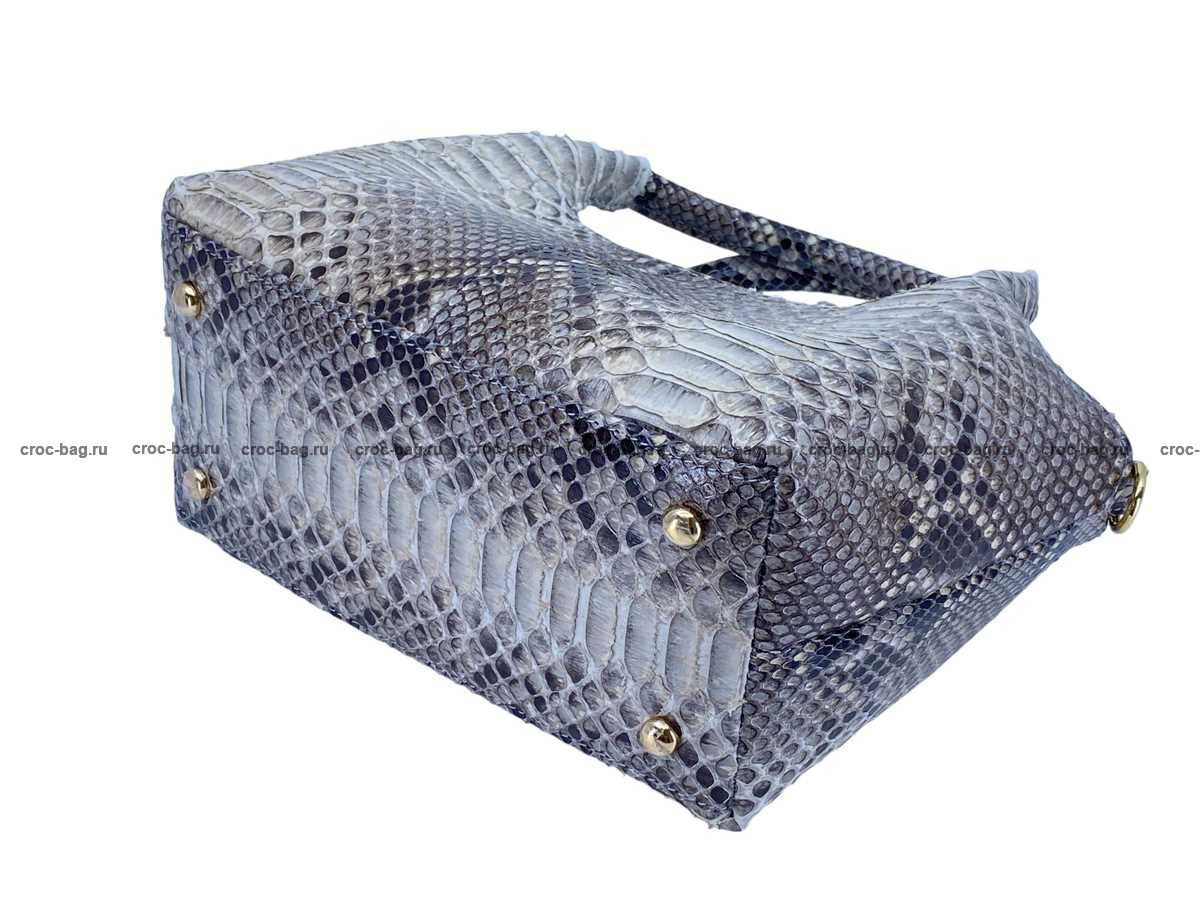 Для пошива сумок данной модели используется натуральная кожи питона, кожа питона высокого качества выделки и окраса. Сумка выполнена с расширением от низа к верху. В верхней части сумки устроены удобные ручки, расстояние в 15см от верха сумки до ручек позволяет носить данную сумку, как в руке, так и на предплечье. Данная сумка не имеет ярко выраженной лицевой или обратной сторон и посему сумкой данной модели с одинаковой степенью удобства могут пользоваться как правши, так и левши. В верхней части сумки вшита молния преграждающая доступ в основной объем сумки. Сумка внутри выполнена в одном объеме, для большего удобства внутри сумки устроена два широких накладных кармана, верхняя часть кармана имеет декоративную отделку полоской питоновой кожи. Материал подклада мягкая ткань. На боковых поверхностях сумки вшиты D-образные металлические кольца для крепления съемного плечевого ремня. Плечевой ремень поставляется в комплекте с данной сумкой. Плечевой ремень изготовлен из кожи теленка имеет регулировку по длине и в качестве дополнительного украшения внешняя часть плечевого ремня отделана кожей питона. Дно сумки выполнено с применением питоновой кожи и оборудовано металлическими ножками. При пошиве сумок данной модели использована металлическая фурнитура высокого качества и золотого цвета. Эта сумка была отшита в серии сумок из кожи питона в различных цветах.