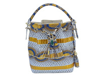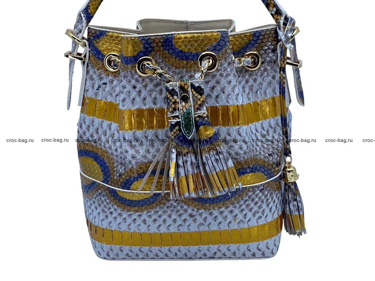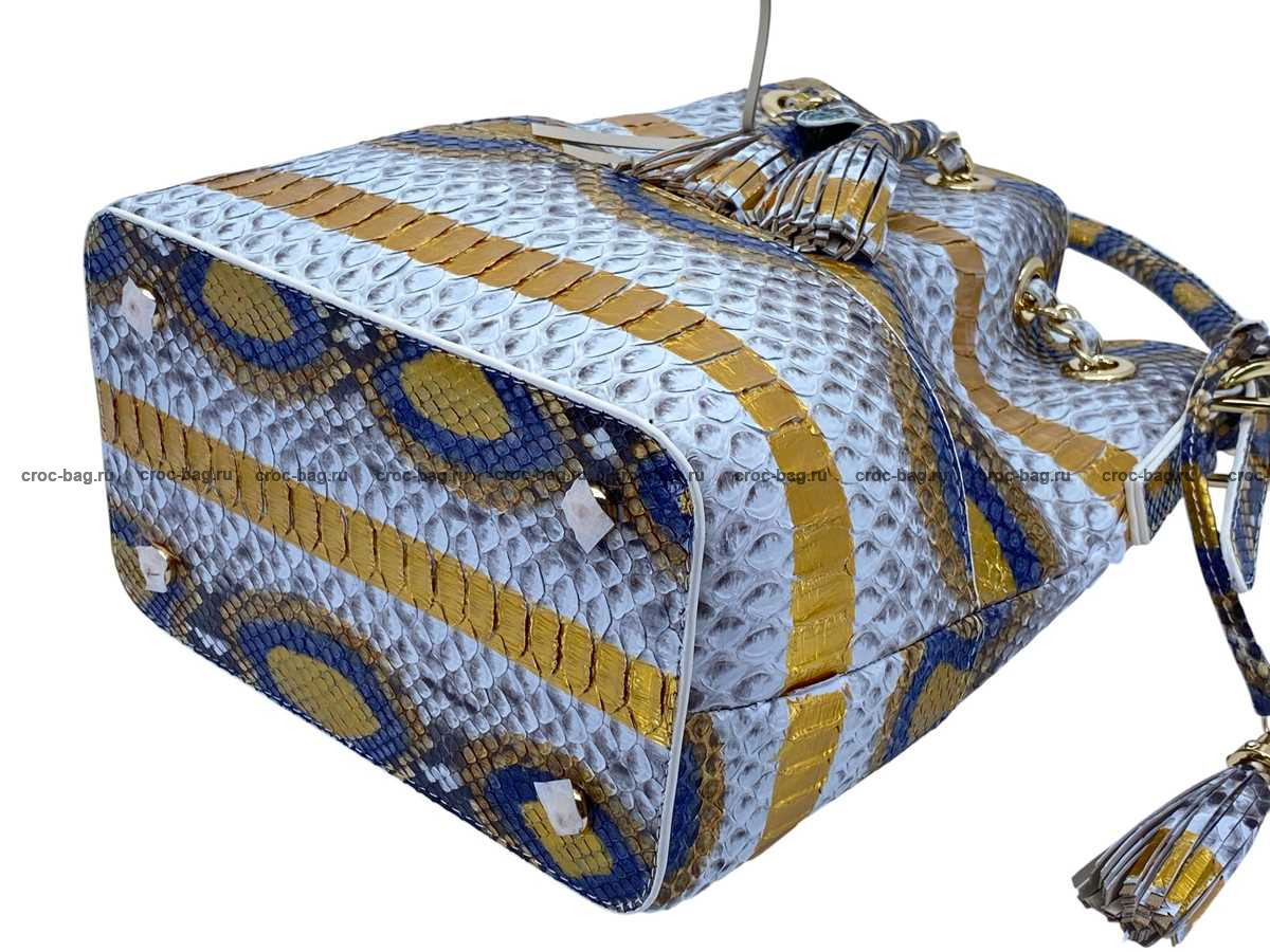 Женская сумка из натуральной кожи питона, натурального окраса с золотыми и синими украшениями