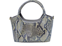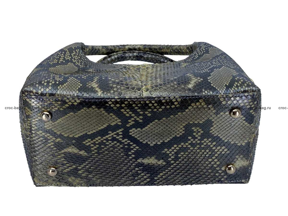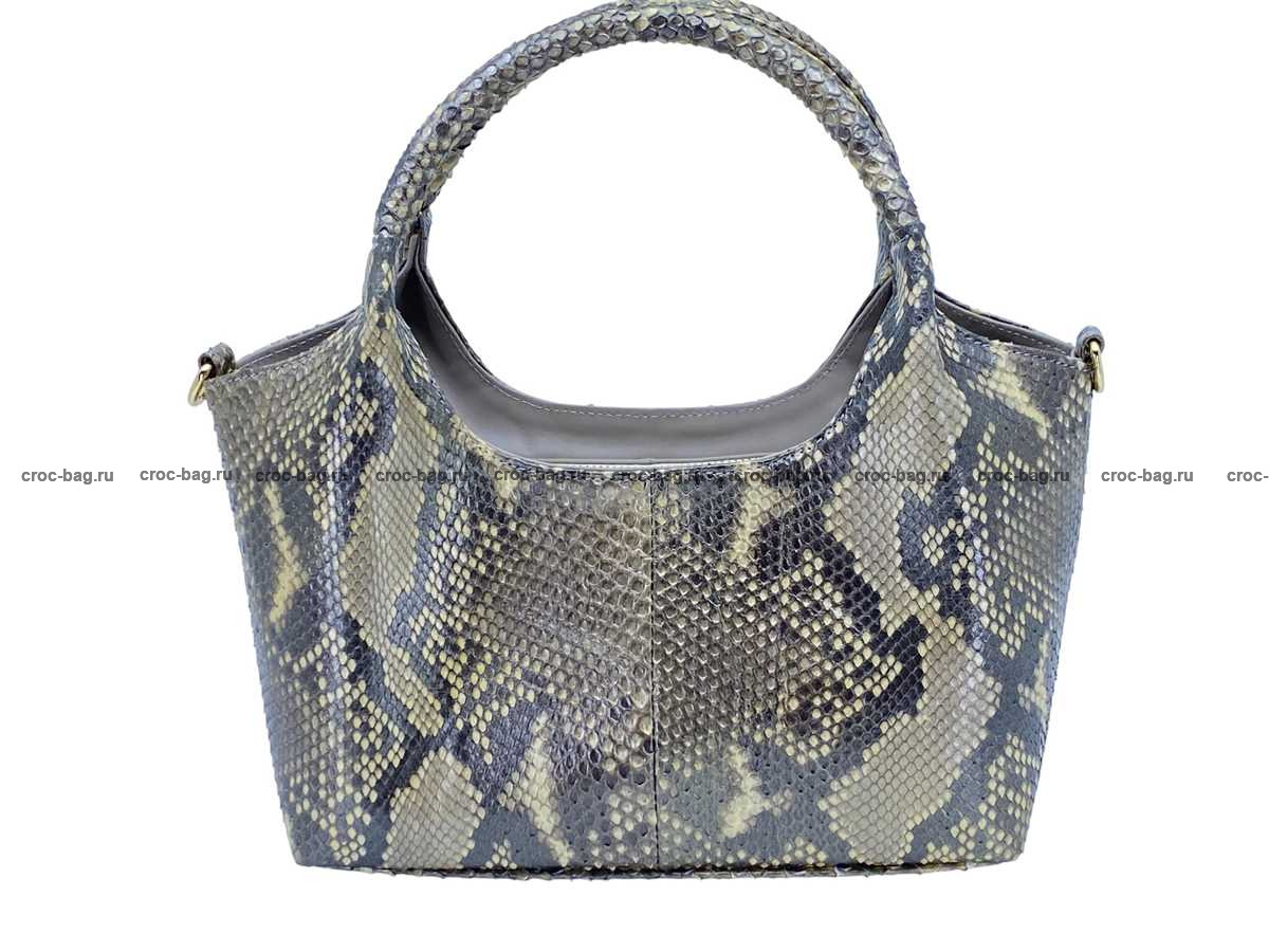 Для пошива сумок данной модели используется натуральная кожи питона, кожа питона высокого качества выделки и окраса. Сумка выполнена с расширением от низа к верху. В верхней части сумки устроены удобные ручки, расстояние в 15см от верха сумки до ручек позволяет носить данную сумку, как в руке, так и на предплечье. Данная сумка не имеет ярко выраженной лицевой или обратной сторон и посему сумкой данной модели с одинаковой степенью удобства могут пользоваться как правши, так и левши. В верхней части сумки вшита молния преграждающая доступ в основной объем сумки. Сумка внутри выполнена в одном объеме, для большего удобства внутри сумки устроена два широких накладных кармана, верхняя часть кармана имеет декоративную отделку полоской питоновой кожи. Материал подклада мягкая ткань. На боковых поверхностях сумки вшиты D-образные металлические кольца для крепления съемного плечевого ремня. Плечевой ремень поставляется в комплекте с данной сумкой. Плечевой ремень изготовлен из кожи теленка имеет регулировку по длине и в качестве дополнительного украшения внешняя часть плечевого ремня отделана кожей питона. Дно сумки выполнено с применением питоновой кожи и оборудовано металлическими ножками. При пошиве сумок данной модели использована металлическая фурнитура высокого качества и золотого цвета. Эта сумка была отшита в серии сумок из кожи питона в различных цветах.
