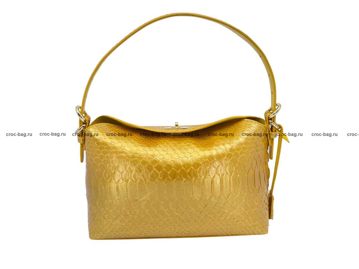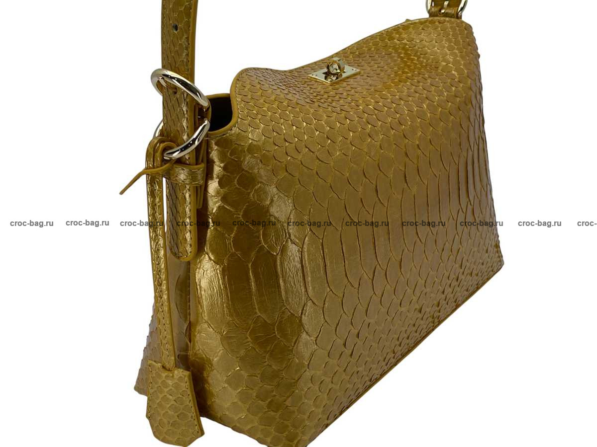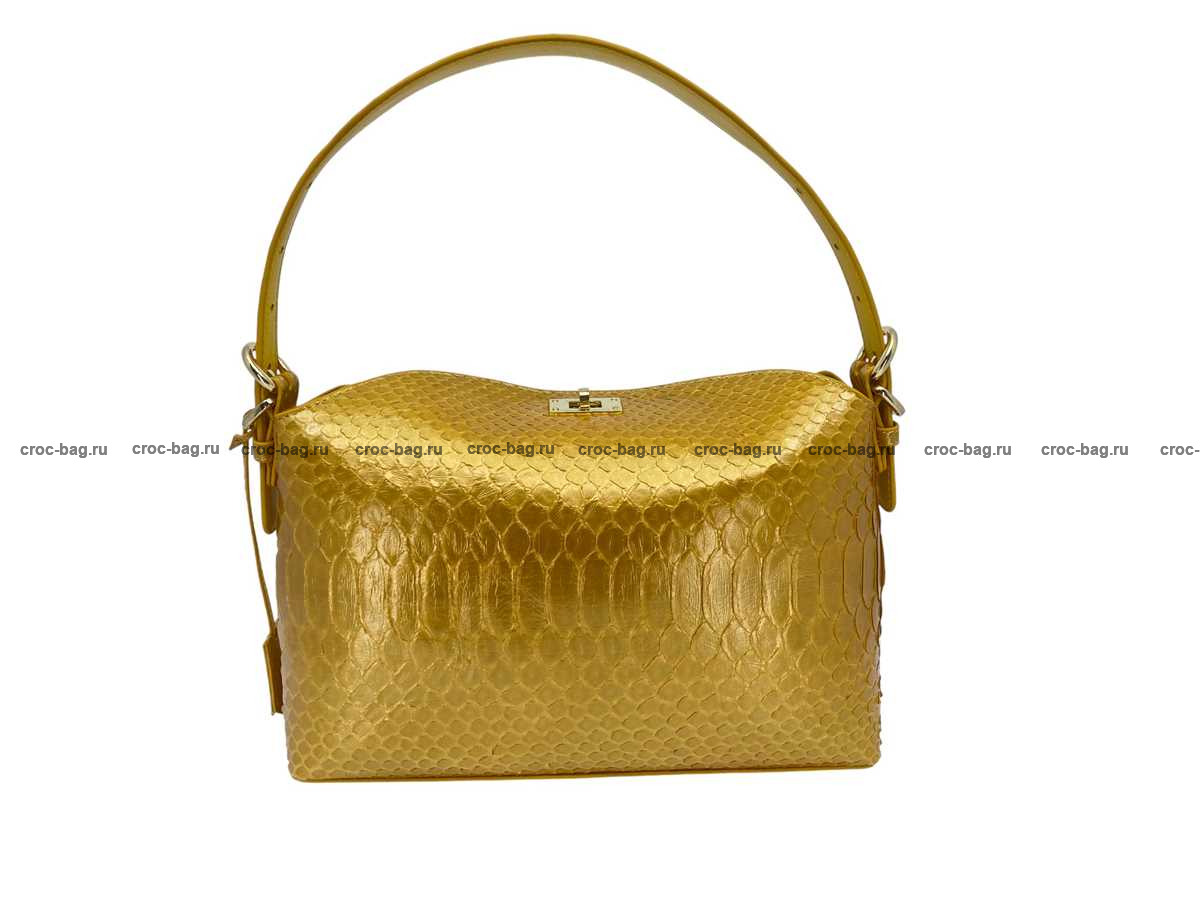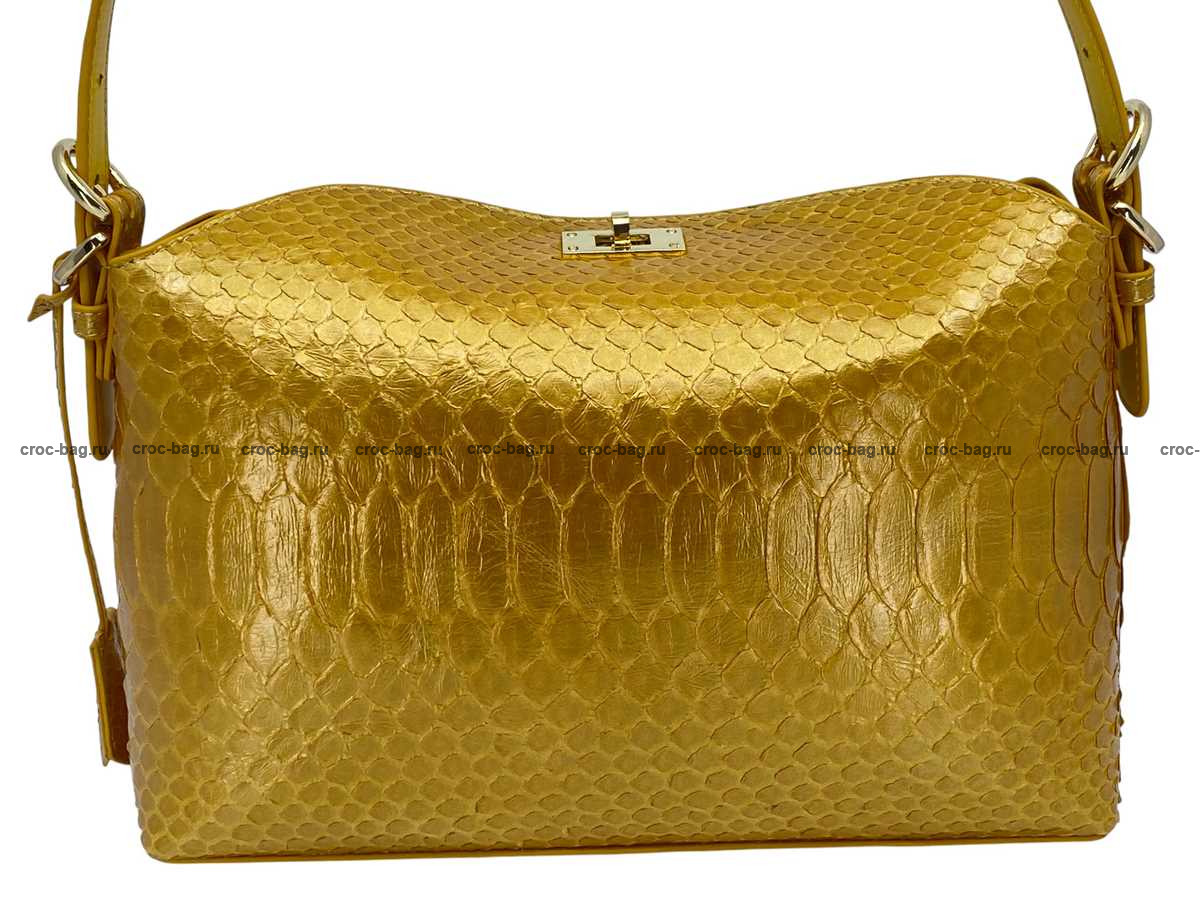 Удобная плечевая сумка изготовлена из натуральной кожи питона. В верхней части сумки устроена удобная широкая ручка, высота данной ручки позволяет носить данную сумку как на плече, на предплечье, так и в руке. Все внешние элементы сумки отшиты из натуральной питоновой кожи. В верхней части сумки устроен широкий клапан, который преграждает доступ в основной объем сумки, этот клапан закрывается на поворотный замочек. Сумка внутри выполнена в одном объеме, внутри сумки устроены два удобных широких кармана, внешняя кромка кармана имеет отделку кожей питона под цвет сумки. В качестве материала подклада применена мягкая ткань серого цвета. Дно сумки также выполнено с применением кожи питона, также дно сумки оборудовано металлическими ножками. При пошиве данных сумок использовалась фурнитура золотого цвета. В качестве дополнительного украшения сумки к одной из сторон ручки прикреплен шнурок из питоновой кожи с декоративным ключиком. В комплекте с сумкой идет плечевой ремень, ремень с регулировкой по длине, ремень выполнен из кожи теленка, внешняя часть плечевого ремня украшена кожей питона.