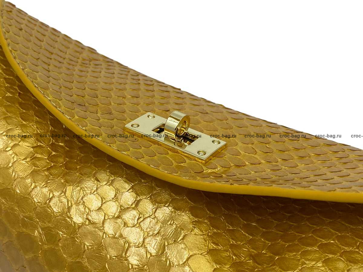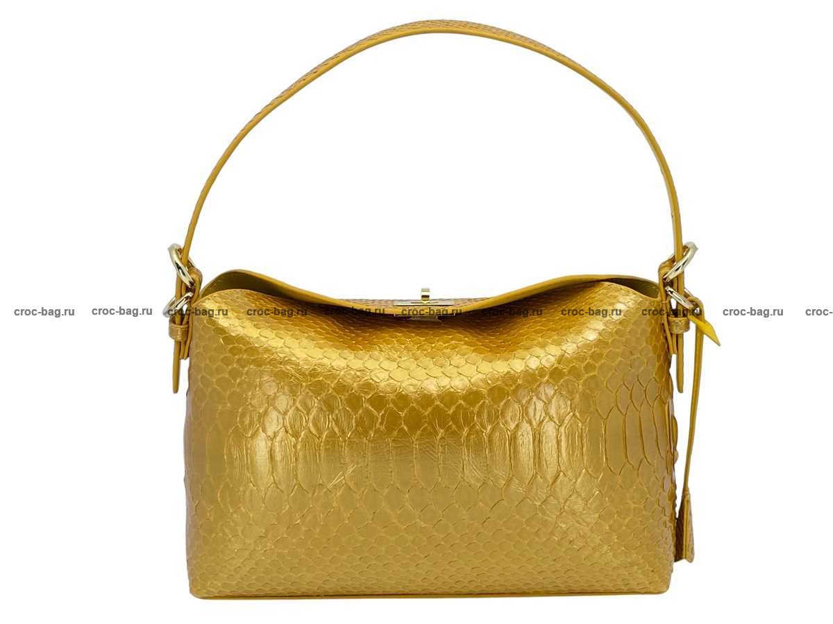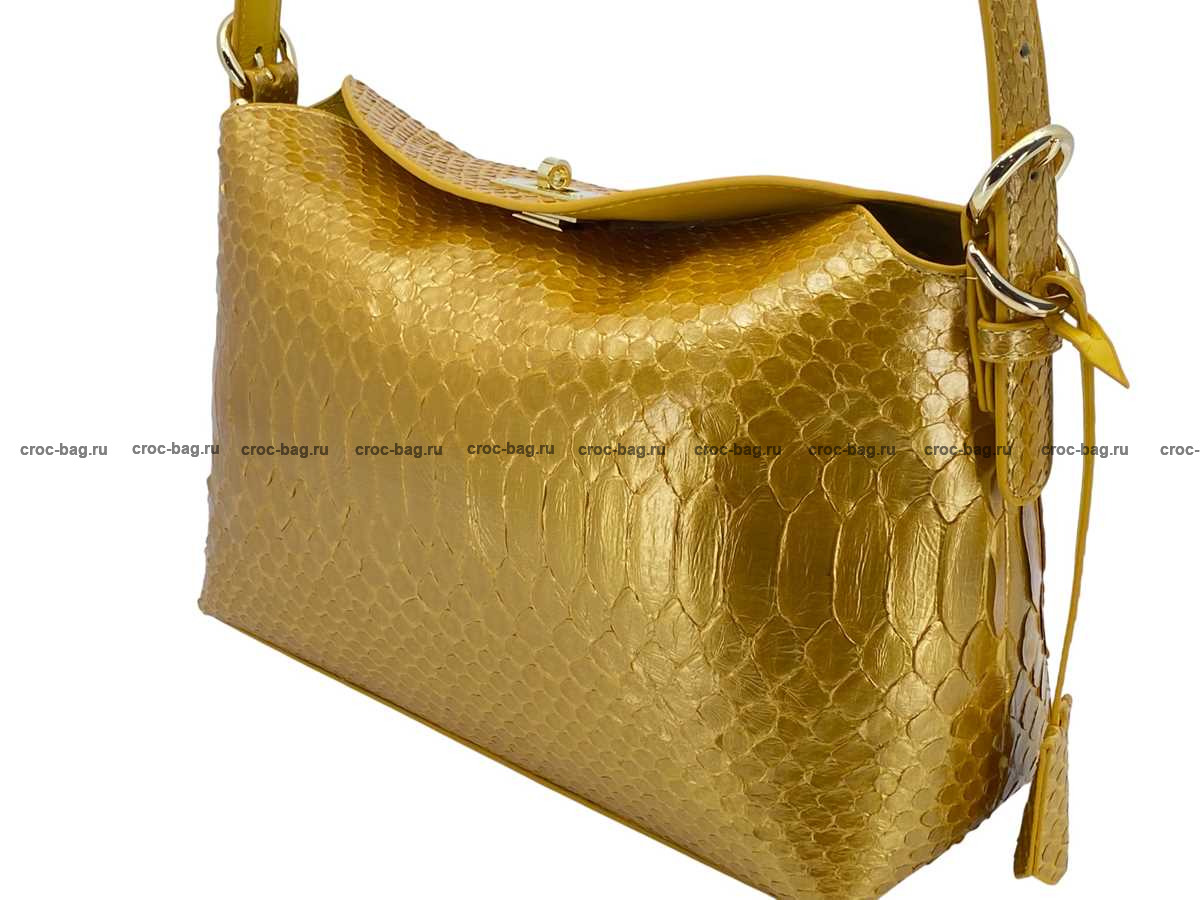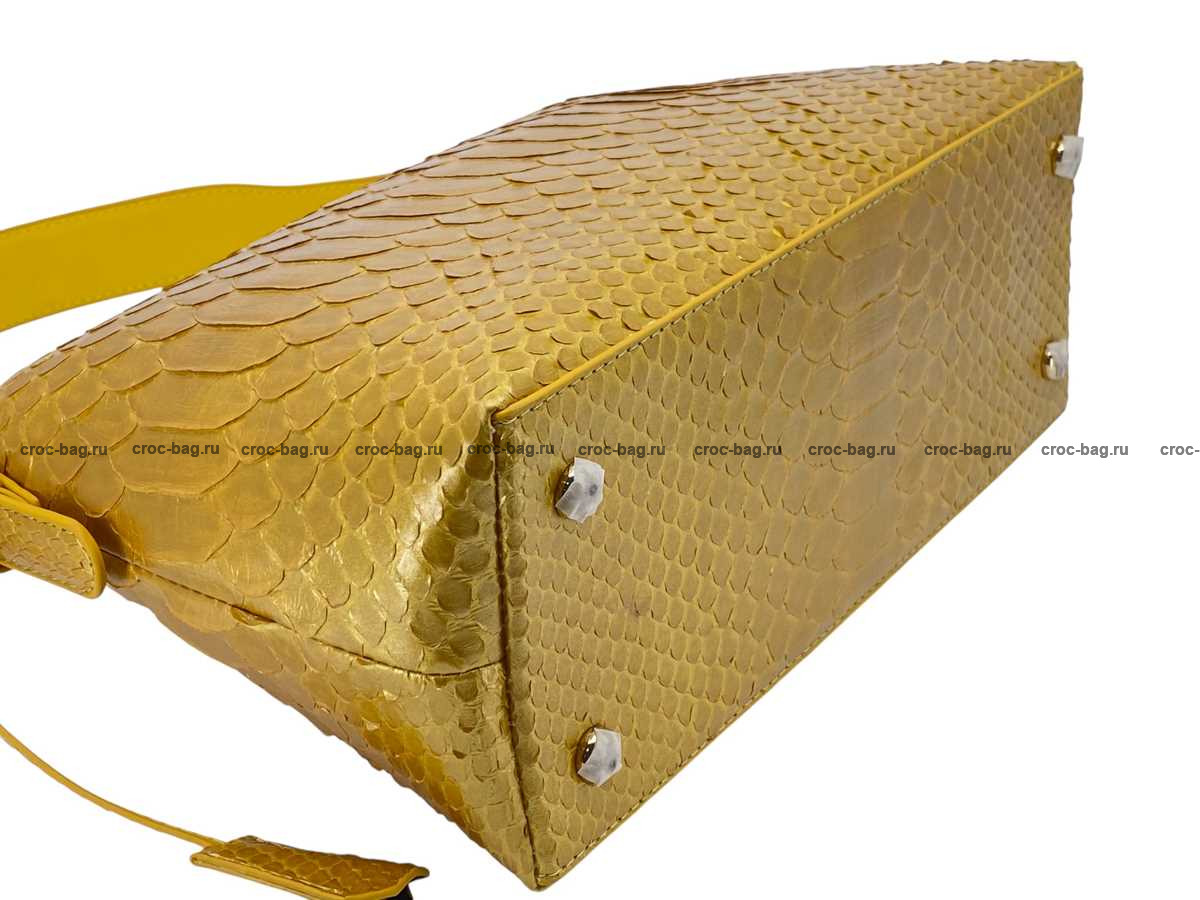 Удобная плечевая сумка изготовлена из натуральной кожи питона. В верхней части сумки устроена удобная широкая ручка, высота данной ручки позволяет носить данную сумку как на плече, на предплечье, так и в руке. Все внешние элементы сумки отшиты из натуральной питоновой кожи. В верхней части сумки устроен широкий клапан, который преграждает доступ в основной объем сумки, этот клапан закрывается на поворотный замочек. Сумка внутри выполнена в одном объеме, внутри сумки устроены два удобных широких кармана, внешняя кромка кармана имеет отделку кожей питона под цвет сумки. В качестве материала подклада применена мягкая ткань серого цвета. Дно сумки также выполнено с применением кожи питона, также дно сумки оборудовано металлическими ножками. При пошиве данных сумок использовалась фурнитура золотого цвета. В качестве дополнительного украшения сумки к одной из сторон ручки прикреплен шнурок из питоновой кожи с декоративным ключиком. В комплекте с сумкой идет плечевой ремень, ремень с регулировкой по длине, ремень выполнен из кожи теленка, внешняя часть плечевого ремня украшена кожей питона.