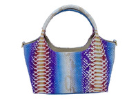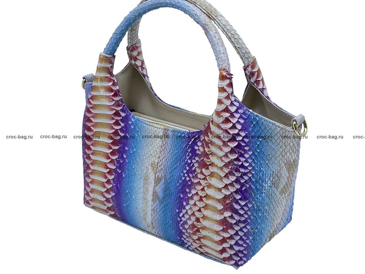 Для пошива сумок данной модели используется натуральная кожи питона, кожа питона высокого качества выделки и окраса. Сумка выполнена с расширением от низа к верху. В верхней части сумки устроены удобные ручки, расстояние в 15см от верха сумки до ручек позволяет носить данную сумку, как в руке, так и на предплечье. Данная сумка не имеет ярко выраженной лицевой или обратной сторон и посему сумкой данной модели с одинаковой степенью удобства могут пользоваться как правши, так и левши. В верхней части сумки вшита молния преграждающая доступ в основной объем сумки. Сумка внутри выполнена в одном объеме, для большего удобства внутри сумки устроена два широких накладных кармана, верхняя часть кармана имеет декоративную отделку полоской питоновой кожи. Материал подклада мягкая ткань. На боковых поверхностях сумки вшиты D-образные металлические кольца для крепления съемного плечевого ремня. Плечевой ремень поставляется в комплекте с данной сумкой. Плечевой ремень изготовлен из кожи теленка имеет регулировку по длине и в качестве дополнительного украшения внешняя часть плечевого ремня отделана кожей питона. Дно сумки выполнено с применением питоновой кожи и оборудовано металлическими ножками. При пошиве сумок данной модели использована металлическая фурнитура высокого качества и золотого цвета. Эта сумка была отшита в серии сумок из кожи питона в различных цветах.