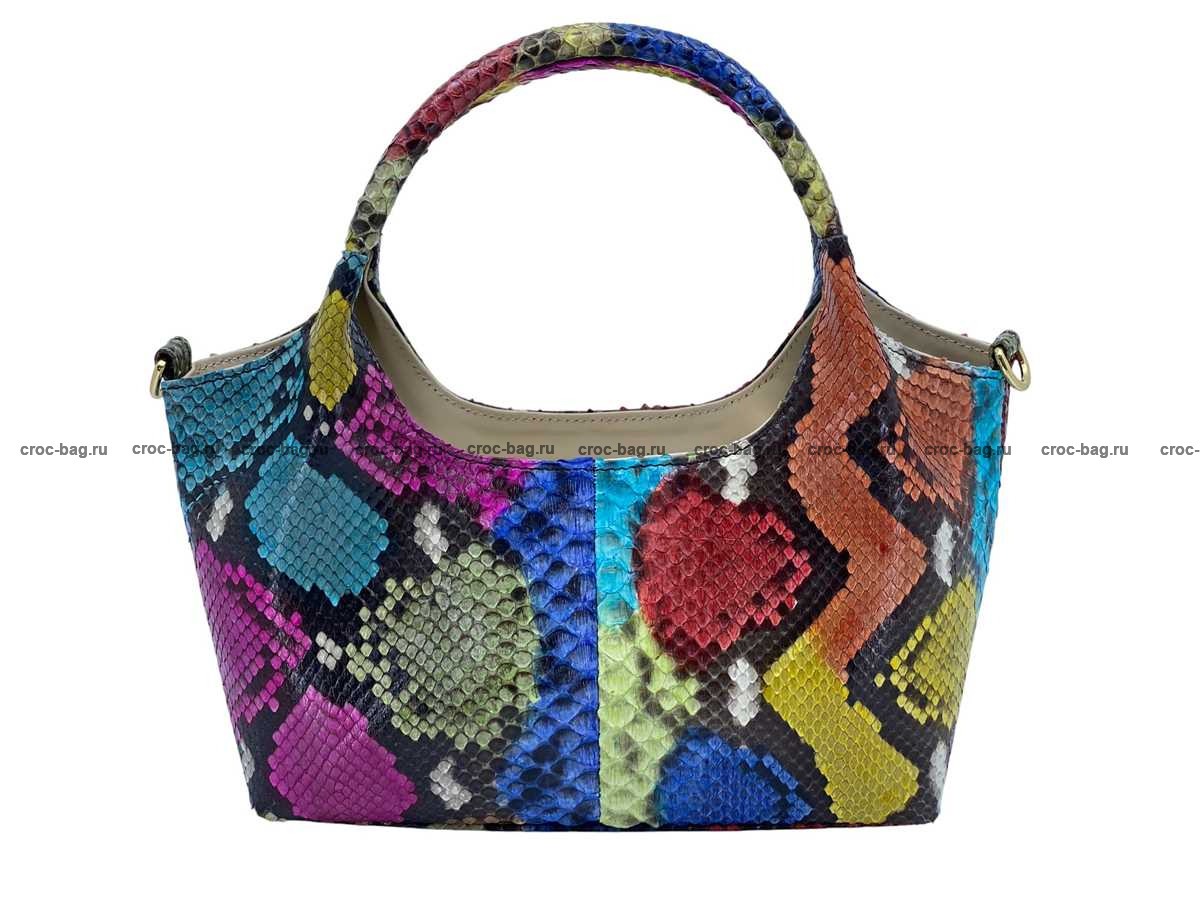 Для пошива сумок данной модели используется натуральная кожи питона, кожа питона высокого качества выделки и окраса. Сумка выполнена с расширением от низа к верху. В верхней части сумки устроены удобные ручки, расстояние в 15см от верха сумки до ручек позволяет носить данную сумку, как в руке, так и на предплечье. Данная сумка не имеет ярко выраженной лицевой или обратной сторон и посему сумкой данной модели с одинаковой степенью удобства могут пользоваться как правши, так и левши. В верхней части сумки вшита молния преграждающая доступ в основной объем сумки. Сумка внутри выполнена в одном объеме, для большего удобства внутри сумки устроена два широких накладных кармана, верхняя часть кармана имеет декоративную отделку полоской питоновой кожи. Материал подклада мягкая ткань. На боковых поверхностях сумки вшиты D-образные металлические кольца для крепления съемного плечевого ремня. Плечевой ремень поставляется в комплекте с данной сумкой. Плечевой ремень изготовлен из кожи теленка имеет регулировку по длине и в качестве дополнительного украшения внешняя часть плечевого ремня отделана кожей питона. Дно сумки выполнено с применением питоновой кожи и оборудовано металлическими ножками. При пошиве сумок данной модели использована металлическая фурнитура высокого качества и золотого цвета. Эта сумка была отшита в серии сумок из кожи питона в различных цветах.