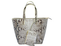 Удобная, крупноразмерная женская сумка шопер из натуральной питоновой кожи. Сумка трапециевидной формы, в верхней части сумки устроены удобные высокие ручки, длина ручек позволяет носить данную сумку как в руке, на предплечье, так и на плече. Доступ в основной объем сумки преграждает металлическая молния. Материал подклада сумки –мягкая ткань. Внутри сумки устроены удобные плоские накладные карманы, по одному карману с каждой стороны. Дно сумки выполнено из кожи питона. Сумки данной модели оснащены съемным плечевым ремешком. Плечевой ремень изготовлен из натуральной кожи теленка, кожа теленка подобрана по цвету под цвет кожи питона, лицевая часть плечевого ремня украшена декоративной вставкой из кожи питона под цвет сумки, плечевой ремень имеет возможность регулировки по длине. В качестве бонуса в комплекте с сумкой данной модели поставляется кошелек на молнии, вы можете видеть данный кошелек на фото, размер кошелька 10х15см.