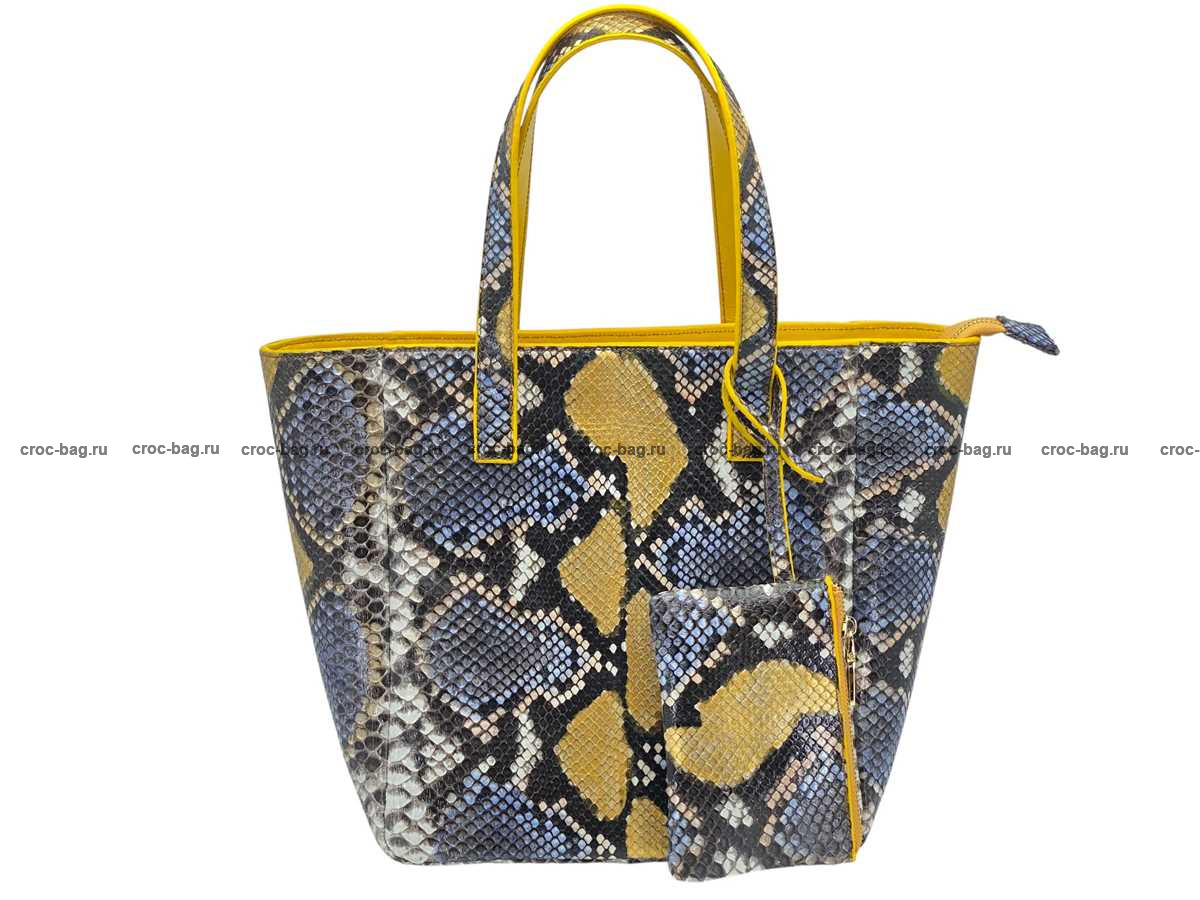 Удобная, крупноразмерная женская сумка шопер из натуральной питоновой кожи. Сумка трапециевидной формы, в верхней части сумки устроены удобные высокие ручки, длина ручек позволяет носить данную сумку как в руке, на предплечье, так и на плече. Доступ в основной объем сумки преграждает металлическая молния. Материал подклада сумки –мягкая ткань. Внутри сумки устроены удобные плоские накладные карманы, по одному карману с каждой стороны. Дно сумки выполнено из кожи питона. Сумки данной модели оснащены съемным плечевым ремешком. Плечевой ремень изготовлен из натуральной кожи теленка, кожа теленка подобрана по цвету под цвет кожи питона, лицевая часть плечевого ремня украшена декоративной вставкой из кожи питона под цвет сумки, плечевой ремень имеет возможность регулировки по длине. В качестве бонуса в комплекте с сумкой данной модели поставляется кошелек на молнии, вы можете видеть данный кошелек на фото, размер кошелька 10х15см.