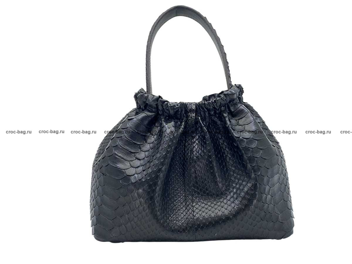 Верх сумки затягивается на два шнурка из кожи питона. Внутри сумка выполнена в одном объеме. Дно сумки прямоугольной формы оборудовано металлическими ножками. Плечевой ремень идет в комплекте с сумкой. Внутри сумки устроен удобный карман. Текстиль используется в качестве материала подклада. Сумки данной модели были отшиты из натуральной кожи питона в различных цветах.