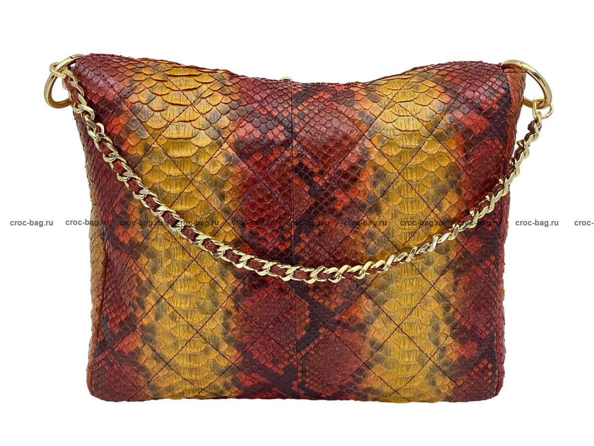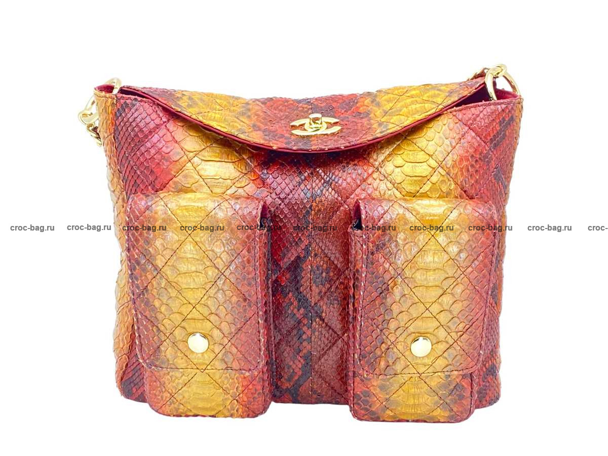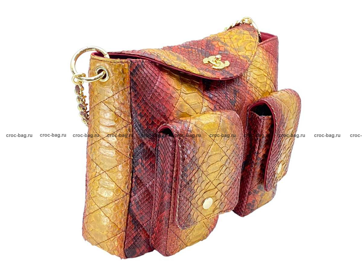 Новая серия женских сумок из натуральной кожи питона. В верхней части сумки устроен клапан, который закрывается на специальный поворотный металлический замочек, замочек золотого цвета выполнен в стиле CHANEL. Металлическая цепочка золотого цвета, в качестве дополнительного украшения звенья цепочки оплетены питоновой кожей под цвет изделия, крепится к боковым поверхностям сумки в верхней части и служит в качестве основной ручки сумки. Расстояние от верха сумки до верха ручки-17-18см,что позволяет носить данную сумку как в руках, так на предплечье, а в некоторых случаях и на плече. В качестве дополнительного украшения сумки на лицевой ее части устроены два объемных накладных вертикальных кармана. Карманы выполнены в коже питона ширина – 9см, высота 17см, толщина -2,5см. Карманы закрываются на металлическую кнопку. Внутренняя поверхность сумки устроена в коже теленка, внутри сумка выполнена в одном объеме, для удобства пользования внутри сумки устроены большие накладные удобные карманы, верхняя часть карманов имеет отделку полоской питоновой кожи. В качестве материала подклада используется мягкая и приятная на ощупь ткань серого цвета. В комплекте с питоновой сумкой идет плечевой ремень, плечевой ремень отшит из кожи теленка и имеет возможность регулировки по длине, для дополнительного украшения внешняя часть плечевого имеет отделку кожей питона. Сумки данной модели были отшиты из кожи питона одной серией в различных цветах.