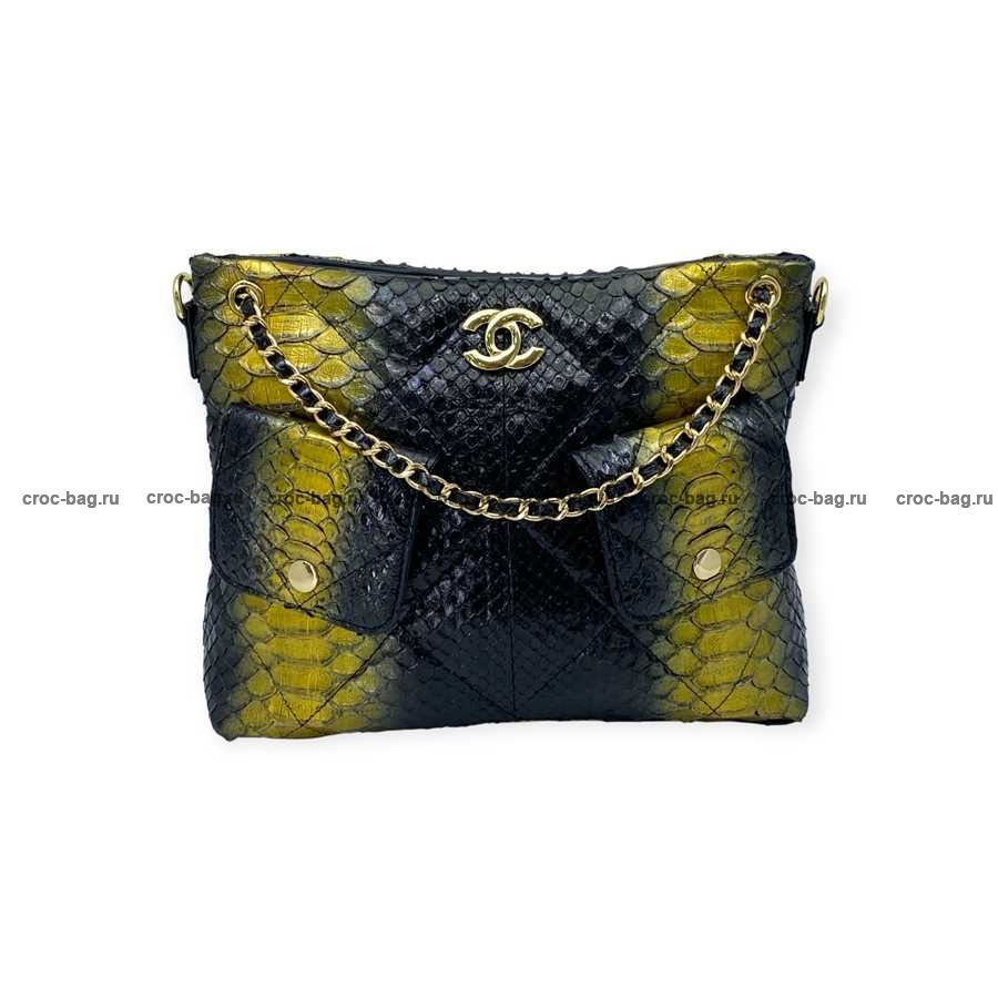 Женская сумка в стиле CHANEL из натуральной кожи питона цвет черный с золотым