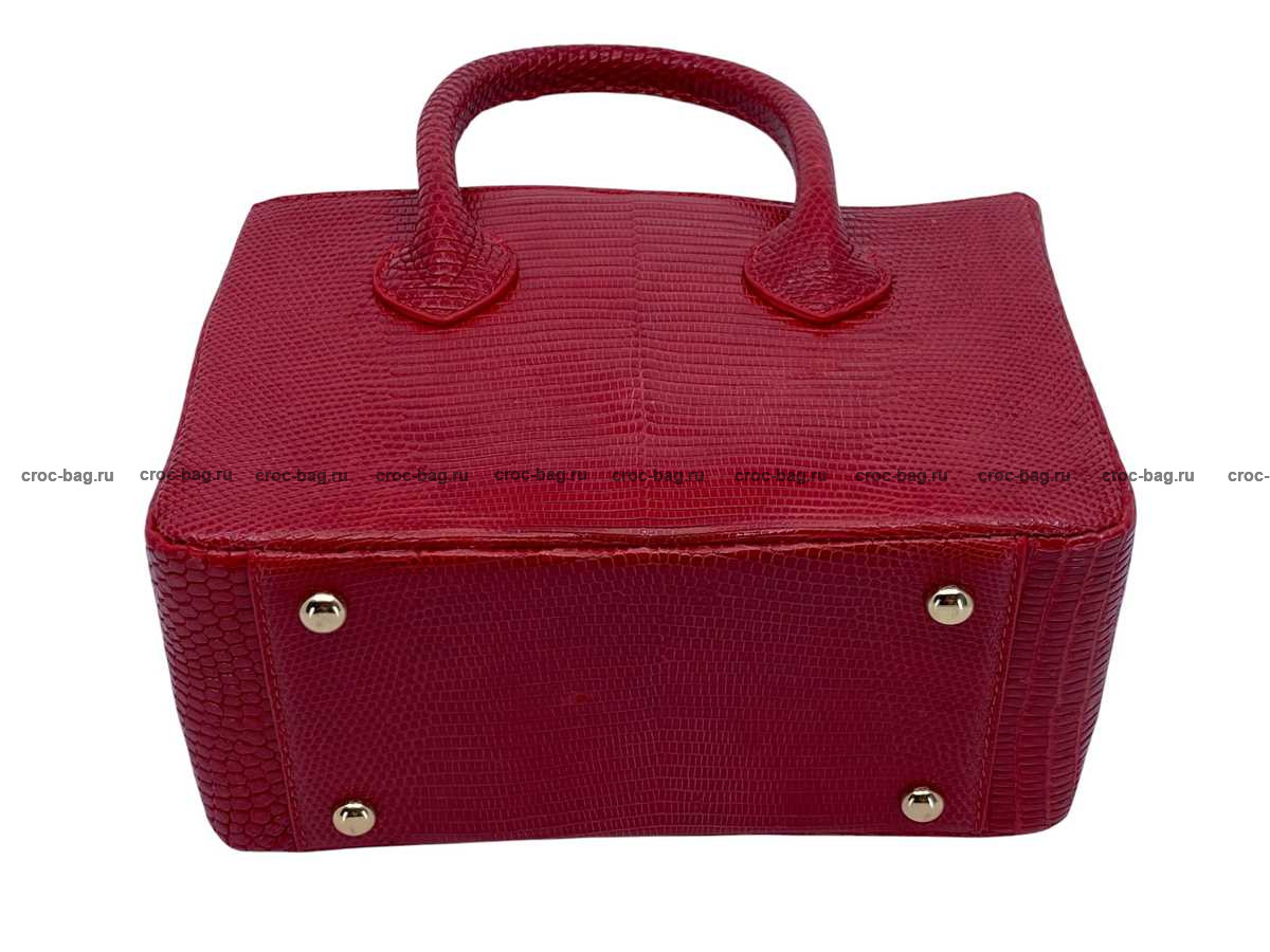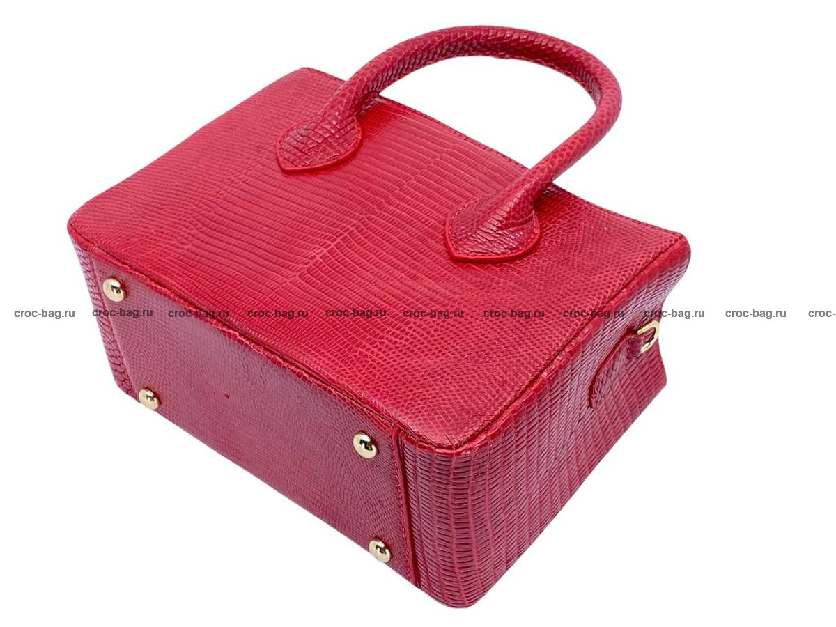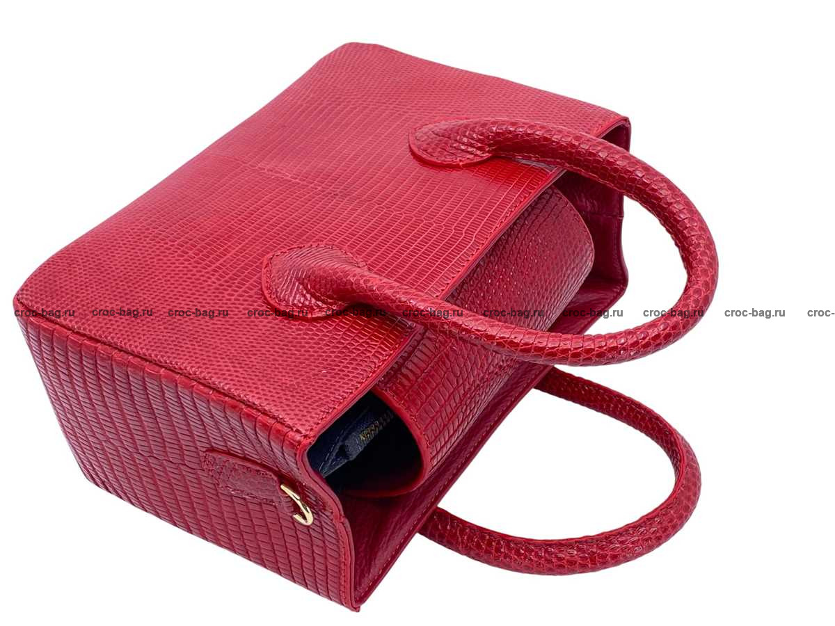 Прямоугольная женская сумка из натуральной кожи ящерицы. В верхней части сумки устроены ручки отшитые из кожи варана, Все внешние стороны сумки отшиты из кожи варана, включая дно сумки. Доступ в основной объем сумки преграждает широкий клапан выполненный из кожи варана, с одной стороны клапан пришит, с противоположной стороны клапан фиксируется на металлическую магнитную кнопку. На боковых поверхностях сумки расположены D-образные металлические кольца для крепления съемного плечевого ремня, идущего в комплекте с сумкой. Съемный плечевой ремень из натуральной кожи теленка, украшен декоративной лицевой накладной из кожи варана с регулировкой по длине. Плоский карман на молнии делит сумку на два объема. Кожа теленка и текстиль используются в качестве материалов подклада. Для дополнительного удобства пользования данной сумкой внутри устроено два плоских накладных кармана, верхняя часть карманов имеет декоративную отделку кожей ящерицы. При пошиве сумок данной модели использована металлическая фурнитура высокого качества, в золотом цвете.