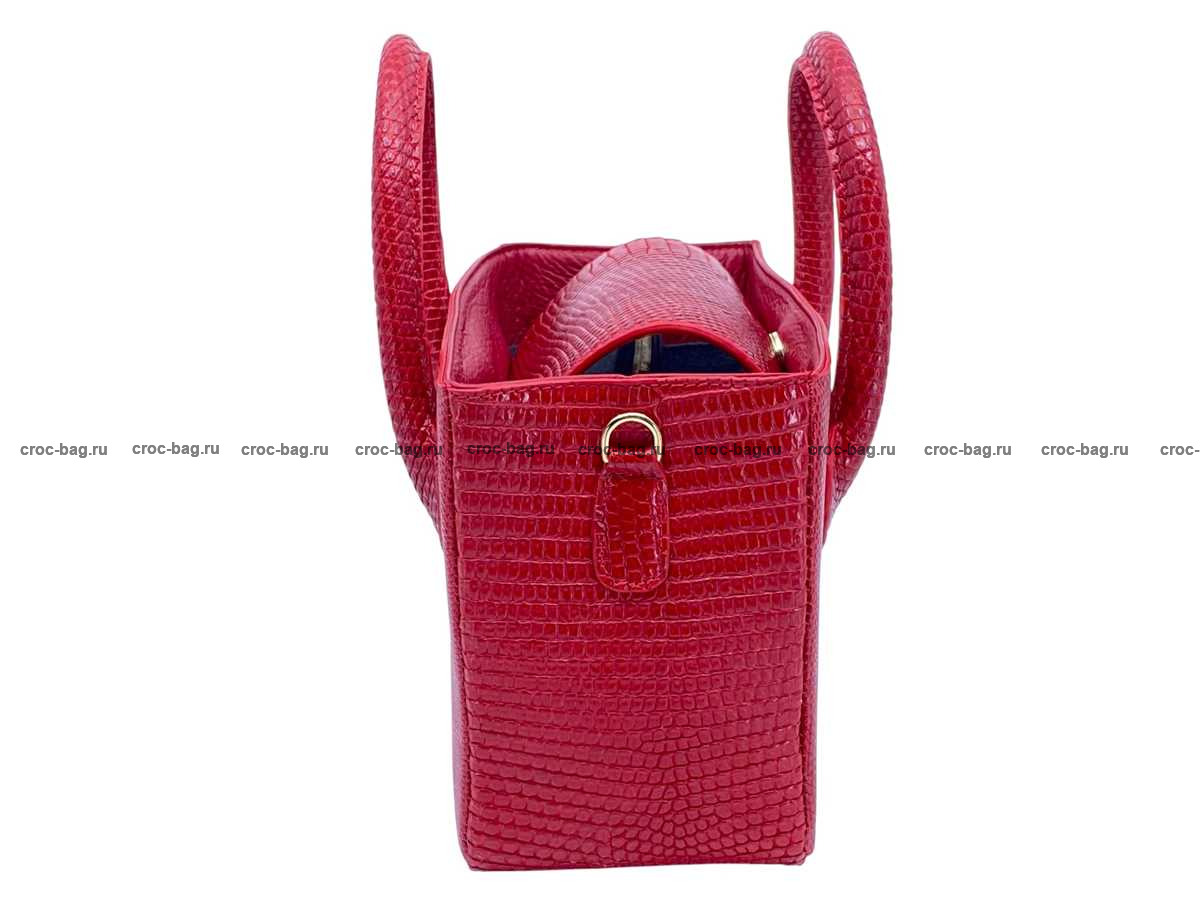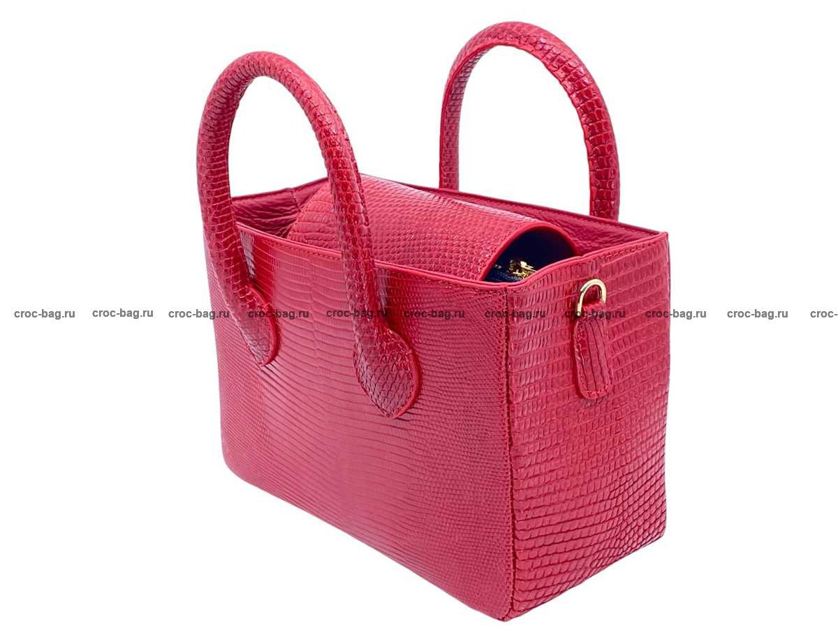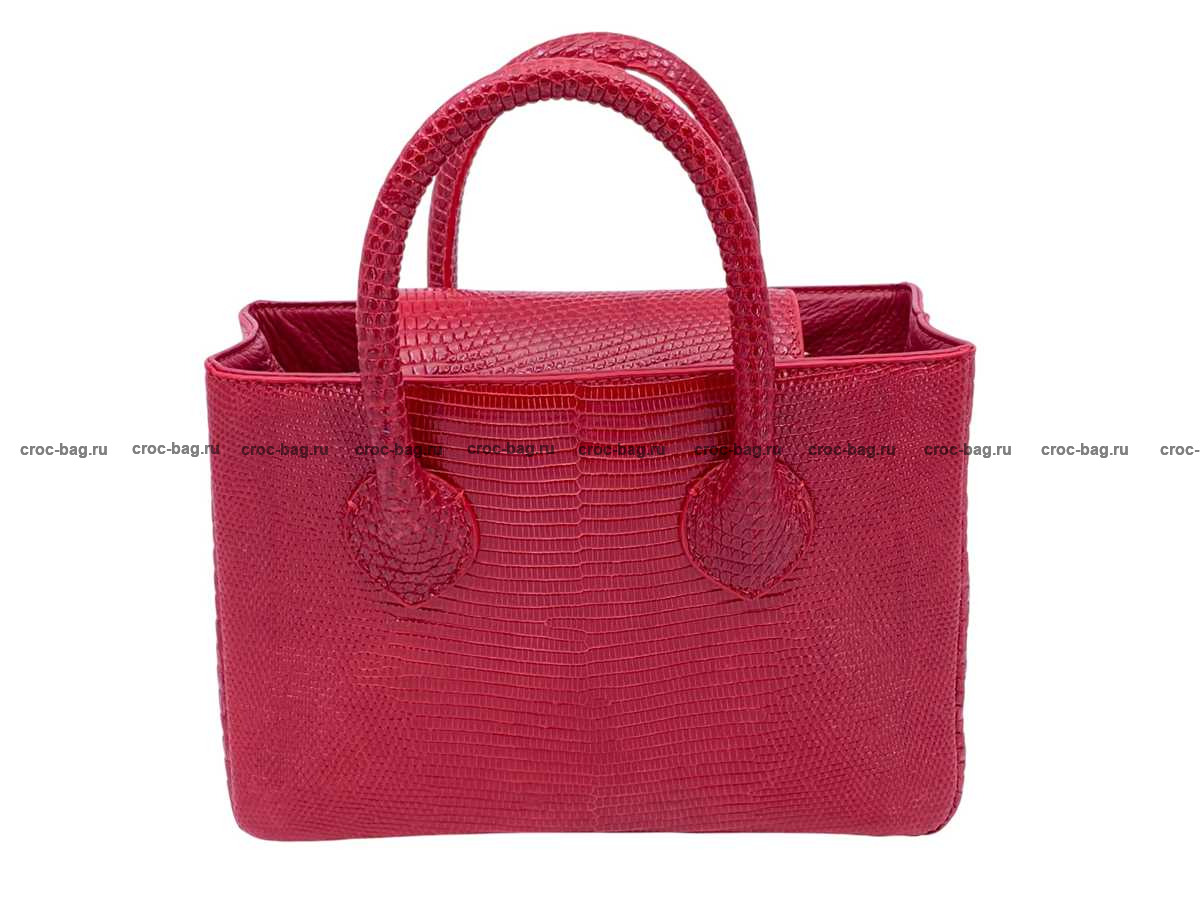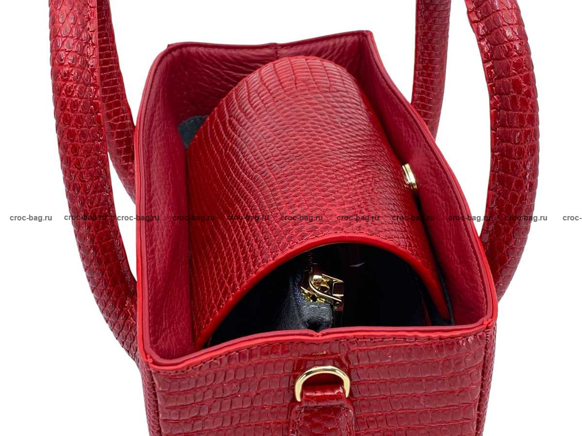 Прямоугольная женская сумка из натуральной кожи ящерицы. В верхней части сумки устроены ручки отшитые из кожи варана, Все внешние стороны сумки отшиты из кожи варана, включая дно сумки. Доступ в основной объем сумки преграждает широкий клапан выполненный из кожи варана, с одной стороны клапан пришит, с противоположной стороны клапан фиксируется на металлическую магнитную кнопку. На боковых поверхностях сумки расположены D-образные металлические кольца для крепления съемного плечевого ремня, идущего в комплекте с сумкой. Съемный плечевой ремень из натуральной кожи теленка, украшен декоративной лицевой накладной из кожи варана с регулировкой по длине. Плоский карман на молнии делит сумку на два объема. Кожа теленка и текстиль используются в качестве материалов подклада. Для дополнительного удобства пользования данной сумкой внутри устроено два плоских накладных кармана, верхняя часть карманов имеет декоративную отделку кожей ящерицы. При пошиве сумок данной модели использована металлическая фурнитура высокого качества, в золотом цвете.
