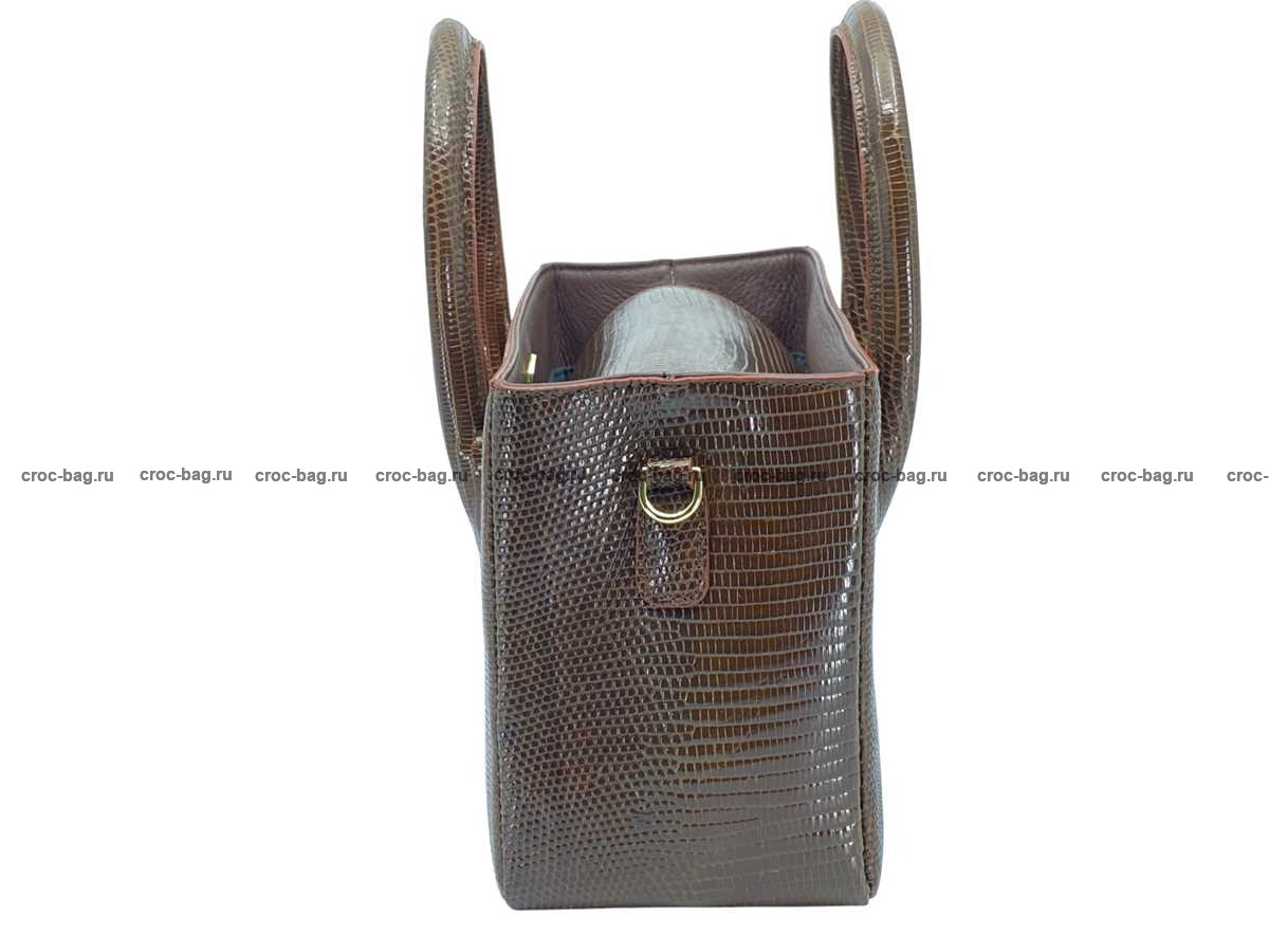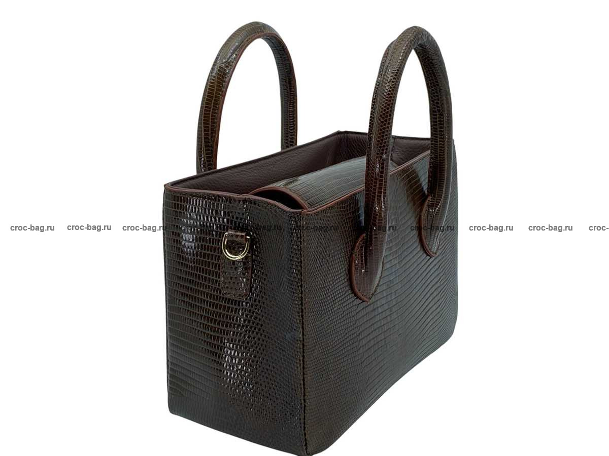 Прямоугольная женская сумка из натуральной кожи ящерицы. В верхней части сумки устроены ручки отшитые из кожи варана, Все внешние стороны сумки отшиты из кожи варана, включая дно сумки. Доступ в основной объем сумки преграждает широкий клапан выполненный из кожи варана, с одной стороны клапан пришит, с противоположной стороны клапан фиксируется на металлическую магнитную кнопку. На боковых поверхностях сумки расположены D-образные металлические кольца для крепления съемного плечевого ремня, идущего в комплекте с сумкой. Съемный плечевой ремень из натуральной кожи теленка, украшен декоративной лицевой накладной из кожи варана с регулировкой по длине. Плоский карман на молнии делит сумку на два объема. Кожа теленка и текстиль используются в качестве материалов подклада. Для дополнительного удобства пользования данной сумкой внутри устроено два плоских накладных кармана, верхняя часть карманов имеет декоративную отделку кожей ящерицы. При пошиве сумок данной модели использована металлическая фурнитура высокого качества, в золотом цвете.