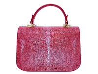 Женская сумка из натуральной полированной кожи морского ската красного цвета. Для пошива сумок данной модели применена высококачественная полированная кожа морского ската, эластичная и очень приятная на ощупь. На лицевой части сумки устроен откидывающийся вверх клапан, клапан выполнен из полированной кожи морского ската. В качестве украшения лицевого клапана вы видите несколько крупных белых точек, эти точки есть центральная крупнозернистая часть шкурки морского ската. В нижней части, лицевой клапан фиксируется на металлическую магнитную кнопку, устроенную на внутренней части клапана. Обратная часть сумки выполнена из полированной кожи морского ската, в верхней части сумки на обратной стороне сумки устроен широкий плоский карман. В верхней части сумки прикреплена верхняя ручка, слева и справа, в местах крепления ручки устроены металлические кольца для крепления плечевого ремня. Верхняя ручка выполнена на основании из кожи теленка, верхняя часть ручки выполнена из полированной кожи морского ската. Центральные части боковых вставок сумки выполнены из полированной кожи морского ската. Дно сумки выполнено из кожи теленка, кожа теленка по цвету подобрана под цвет кожи морского ската. Для большей эластичности сумки и для повышения ее вместимости, на боковых поверхностях сумки, слева и справа от вставок из кожи морского ската выполнены эластичные вставки из кожи теленка, такие же вставки, для повышения эластичности и вместительности сумки выполнены и на дне. Съемный, с возможностью регулировки по длине, выполненный из натуральной кожи теленка, плечевой ремень поставляется в комплекте с сумкой. Кожаный плечевой ремень, шириной 1,5см по цвету кожа теленка для плечевого ремня подобрана под цвет кожи морского ската. Лицевая поверхность сумки под лицевым клапаном выполнена из кожи теленка. Плоский карман на металлической молнии делит внутренний объем сумки на два отделения. В одном из отделений устроен боковой накладной карман на молнии. В качестве материала подклада сумки используется текстиль и натуральная кожа теленка. Сумки данной модели ошиваются из полированной кожи морского ската и из крашеной кожи морского ската как в монотонные цвета, так и с разноцветными принтами и узорами.