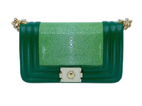 Женская сумка из натуральной полированной кожи морского ската, сумка женская из кожи ската в стиле Chanel. Для пошива сумок данной модели использована натуральная высококачественная, полированная кожа морского ската и кожа теленка. Лицевой, откидывающийся вверх клапан сумки выполнен с применением полированной кожи морского ската и плавно переходит на обратную сторону сумки. В качестве дополнительного украшения лицевого клапана и обратной стороны по периметру выполнены вставка из натуральной кожи теленка. В нижней части клапана устроен металлический замок, этим замком клапан фиксируется к сумке. В верхней части лицевого клапана, по краям выполнены крепления плечевого ремня. Плечевой ремень в сумках данной модели выполнен из объемной и толстой металлической цепочки золотого цвета и его центральная вставка, выполнена из кожи теленка, плечевой ремень имеет два расстояния от верха сумки, первое – 60см что позволяет удобно носить данную сумку на плече, и второе расстояние от верха сумки до плечевого ремня – 33см что также позволяет носить данную сумки на плече, но еще и на предплечье, и в руке. Крепление цепочки к сумке выполнено с применением металлических колец D-образной формы золотого цвета. Следует отдельно отметить что вся фурнитура, используемая при пошиве данной сумки выполнена в золотом цвете. Боковые вставки и дно данной сумки изготовлены из натуральной кожи теленка, кожа теленка подобрана по цвету под кожу морского ската. Лицевая поверхность сумки, расположенная под лицевым клапаном, и внутренняя поверхность лицевого клапана также выполнены из кожи теленка зеленого цвета. Сумка внутри выполнена в одном объеме, для большего удобства пользования сумкой внутри изготовлены карманы для предметов первой необходимости: плоский карман на всю ширину сумки расположен между основным объемом и задней стенкой сумки, второй плоский карман находится между основным объемом сумки и лицевой стенкой сумки, а также еще один накладной карман устроен в основном объеме сумки и плоский боковой карман на молнии также выполнен в основном объеме сумки. Кожа теленка зеленого цвета, и мягкая ткань темно-зеленого цвета применены внутри сумки из кожи морского ската в качестве материала подклада.