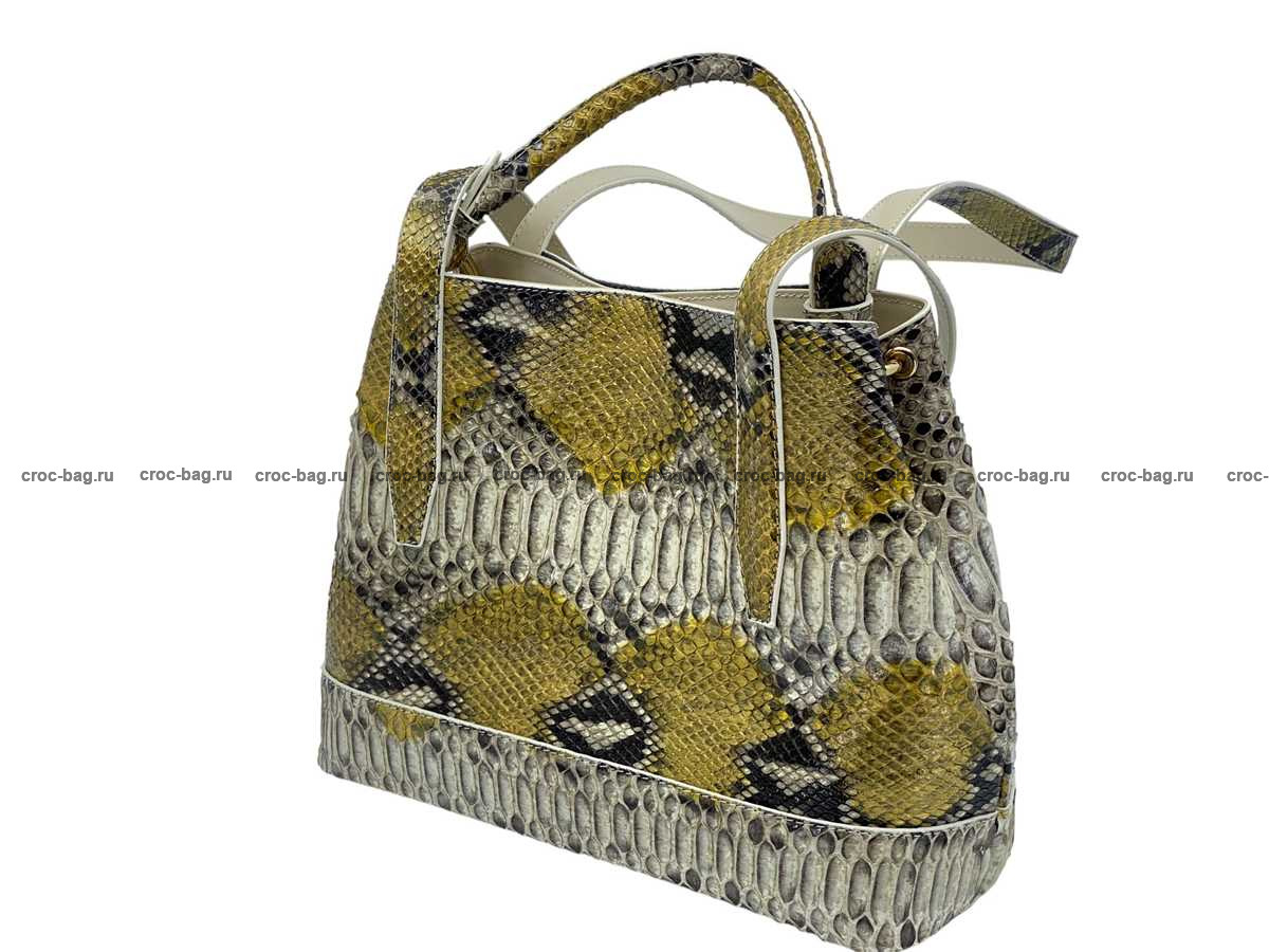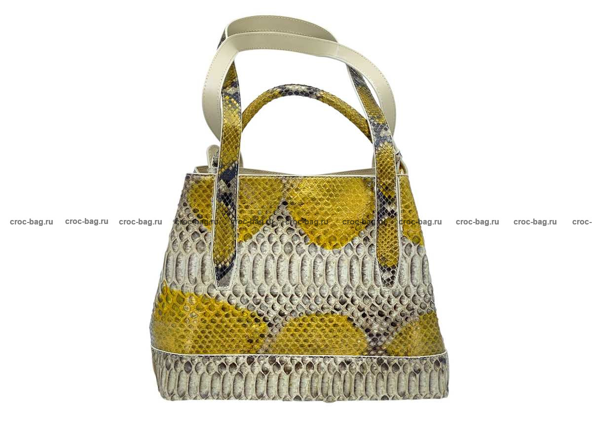 Удобная женская сумка выполнена в трапециевидной форме, сумка имеет несколько удобных ручек, самая длинная из них имеет длину 30см от верха сумки до ручек, такая длина позволяет носить сумку как на плече, так и на предплечье. Вторая ручка имеет высоту 10см от верха сумки, такая ручка скорей предназначена для ношения сумки в руках, также данная сумка укомплектована съемным плечевым ремешком. Ремешок изготовлен на основании из натуральной кожи теленка имеет возможность регулировки по длине и внешняя часть плечевого ремня украшена кожей питона. Все наружные поверхности сумки отшиты с применением натуральной кожи питона. На одной из внешних сторон сумки устроен удобный широкий карман закрывающийся на вшитый скрытый магнит, ширина кармана 15см. Сумка закрывается на металлическую магнитную кнопку вшитую в верхней части сумки. Плоский карман на молнии делит сумку внутри на два отделения, внутри каждого из отделений выполнен широкий плоский накладной карман, внешняя часть кармана имеет отделку полоской из кожи питона. Данная сумка была отшита серией из нескольких сумок в коже питона в разных цветах.
