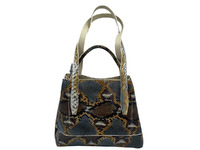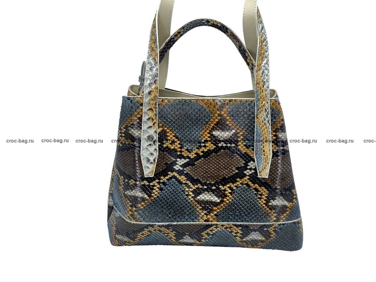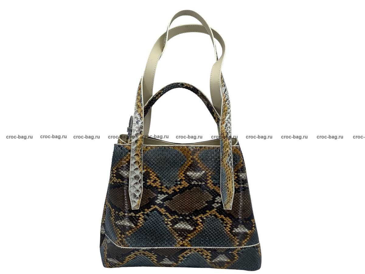 Удобная женская сумка выполнена в трапециевидной форме, сумка имеет несколько удобных ручек, самая длинная из них имеет длину 30см от верха сумки до ручек, такая длина позволяет носить сумку как на плече, так и на предплечье. Вторая ручка имеет высоту 10см от верха сумки, такая ручка скорей предназначена для ношения сумки в руках, также данная сумка укомплектована съемным плечевым ремешком. Ремешок изготовлен на основании из натуральной кожи теленка имеет возможность регулировки по длине и внешняя часть плечевого ремня украшена кожей питона. Все наружные поверхности сумки отшиты с применением натуральной кожи питона. На одной из внешних сторон сумки устроен удобный широкий карман закрывающийся на вшитый скрытый магнит, ширина кармана 15см. Сумка закрывается на металлическую магнитную кнопку вшитую в верхней части сумки. Плоский карман на молнии делит сумку внутри на два отделения, внутри каждого из отделений выполнен широкий плоский накладной карман, внешняя часть кармана имеет отделку полоской из кожи питона. Данная сумка была отшита серией из нескольких сумок в коже питона в разных цветах.