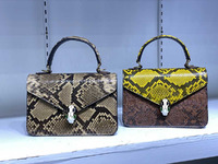 Женские сумки из натуральной питоновой кожи, сумки отшиты в стиле женских сумок Bulgari. Кремового цвета и коричневого цвета с желтыми вставками. На лицевой поверхности сумки устроен откидывающийся вверх лицевой клапан, в верхней части сумки устроена удобная ручка. В качестве основного украшения лицевая поверхность сумки украшена металлической головой змеи с глазками зеленого цвета, такое украшение довольно часто используется в сумках Bulgari. Слева и справа в местах крепления верхней ручки вшиты металлические кольца для крепления плечевого ремня. Съемный, с возможностью регулировки по длине плечевой ремень поставляется в комплекте с сумкой. В качестве материала подклада используется текстиль.