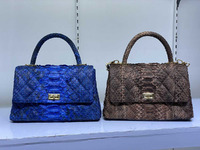 Новая партия женских сумок из натуральной питоновой кожи цвет синий- брюшная часть, цвет коричневый брюшная чать нубук. На лицевой части сумки устроен откидывающийся вверх клапан, клапан фиксируется на поворотный замочек. В верхней части сумки вшита удобная ручка, высота ручки -9см. Съемный плечевой ремешок идет в комплекте с сумкой. Натуральная кожа теленка и текстиль используются в качестве материала подклада сумки.