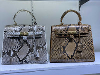 Сумки женские из в стиле сумок Келли 11дюймов. Сумки отшиты из натуральной кожи питона, кожа питона натурального окраса спинная часть и коричневый цвет спинная чать питоновой шкуры. В верхней части сумки вшита ручка, высота ручки 9см. На лицевой части сумки устроен клапан который откидывается вверх и который украшен стандартным декоративным ремешком увенчанным замком. Все внешние поверхности сумки отшиты из кожи питона. Кожа теленка и ткань применены в качестве материалов подклада. Плечевой ремешок поставляется в комплекте с сумкой.