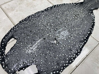 Натуральная полированная кожа морского ската, очень редкий вид кожи ската. Шкура морского ската полированная черного цвета с очень интересным внешним видом, данная шкура СОРТ–Б размеры: Ширина -31см, длина с хвостом – 74см, длина с глазами – 56см, длина без глаз – 46см. На полированной шкуре присутствуют повреждения.