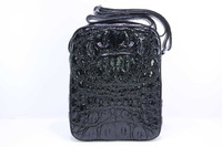 Вертикальная мужская плечевая сумка из натуральной фактурной крокодиловой кожи черного цвета. Ширина-23см, Высота-27см, Толщина-8см. Для пошива плечевых сумок данной модели используется натуральная кожа сиамского крокодила, фактурная спинная часть. Крокодиловая кожа высокого качества выделки и окраса, кожа мягкая эластичная и очень приятна на ощупь. На лицевой стороне сумки мы видим крупную, фактурную и симметричную затылочную часть крокодиловой шкуры, чуть ниже затылочной части фактура меняется на спинную. Обратная часть сумки выполнена с применением фактурной спинной части крокодиловой шкуры. Боковые вставки и дно выполнены с применением фактурной спинной части кожи крокодила. В верхней части сумки вшита металлическая молния преграждающая доступ в основной объем сумки, внутри сумка выполнена в одном объеме, для дополнительного удобства пользования сумкой внутри сумки устроены удобные карманы, сдвоенный накладной и карман на хлястике для планшета. В верхней части боковых поверхностей вшиты металлические кольца к которым крепится несъёмный плечевой ремень. Плечевой ремень выполнен на основании из кожи телека и в качестве дополнительной отделки верхняя часть плечевого ремня отделана кожей крокодила. В качестве материала подклада сумки используется мягкая кожа теленка, цвет кожи теленка подобран под цвет кожи крокодила.