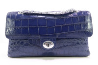 Сумка женская из натуральной крокодиловой кожи, цвет темно синий. Ширина-27см. Высота-16см. Толщина 8-9см. Для пошива сумок данной модели используется натуральная кожа сиамского крокодила – брюшная часть. Кожа высокого качества выделки и окраса, мягкая и приятная на ощупь. Сумка выполнена в стиле Шанель ширина сумки 11 дюймов, удобная, функциональная средне размерная женская крокодиловая сумка. На лицевой поверхности мы видим откидывающийся вверх лицевой клапан, в нижней части сумки этот клапан фиксируется на поворотный замочек. Лицевая часть сумки, обратная сторона, боковые вставки, дно сумки все видимые части выполнены в натуральной коже крокодила. Плоским карманом на молнии внутренний объем сумки разделен на два отделения. Для удобства пользования сумкой внутри устроены кармашки для ключей, телефона и прочее. Внутри сумка полностью выполнена из кожи теленка, кожа теленка подобрана под цвет кожи крокодила. В верхней части сумки расположен плевой ремень. Конструкция плечевого ремня позволяет отрегулировать длину плечевого ремня. Регулировка плечевого ремня может быть двух степеней 1 – длинная, когда плечевой ремень вытягивается через два отверстия и 2 – короткая, когда плечевой ремень вытягивается из четырех отверстий. Металлическая цепочка золотого цвета, оплетенная полоской кожи теленка под цвет кожи крокодила использована в качестве плечевого ремня. На дне сумки устроены 4 ножки золотого цвета, поворотный замок расположенный на лицевой поверхности – золотого цвета. Женские сумки данной модели очень популярны и отшиваются в крокодиловой коже с различной фактурой и различных цветов.