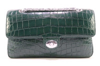 Сумка женская из натуральной крокодиловой кожи, цвет темно-зеленый, изумрудный. Ширина-27см. Высота-16см. Толщина 8-9см. Для пошива сумок данной модели используется натуральная кожа сиамского крокодила – брюшная часть. Кожа высокого качества выделки и окраса, мягкая и приятная на ощупь. Сумка выполнена в стиле Шанель ширина сумки 11 дюймов, удобная, функциональная средне размерная женская крокодиловая сумка. На лицевой поверхности мы видим откидывающийся вверх лицевой клапан, в нижней части сумки этот клапан фиксируется на поворотный замочек. Лицевая часть сумки, обратная сторона, боковые вставки, дно сумки все видимые части выполнены в натуральной коже крокодила. Плоским карманом на молнии внутренний объем сумки разделен на два отделения. Для удобства пользования сумкой внутри устроены кармашки для ключей, телефона и прочее. Внутри сумка полностью выполнена из кожи теленка, кожа теленка подобрана под цвет кожи крокодила. В верхней части сумки расположен плевой ремень. Конструкция плечевого ремня позволяет отрегулировать длину плечевого ремня. Регулировка плечевого ремня может быть двух степеней 1 – длинная, когда плечевой ремень вытягивается через два отверстия и 2 – короткая, когда плечевой ремень вытягивается из четырех отверстий. Металлическая цепочка золотого цвета, оплетенная полоской кожи теленка под цвет кожи крокодила использована в качестве плечевого ремня. На дне сумки устроены 4 ножки золотого цвета, поворотный замок расположенный на лицевой поверхности – золотого цвета. Женские сумки данной модели очень популярны и отшиваются в крокодиловой коже с различной фактурой и различных цветов.