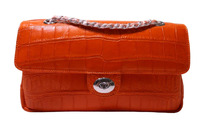 Женская сумка из натуральной крокодиловой кожи оранжевого цвета, сумка в стиле Шанель размер сумки 11 дюймов. Ширина-27см. Высота-16см. Толщина -9см. Для пошива сумок данной модели используется натуральная кожа сиамского крокодила брюшная часть. Крокодиловая кожа высокого качества выделки и окраса, кожа мягкая, упругая и эластичная, очень приятая на ощупь. На лицевой поверхности сумки распложен откидывающийся вверх лицевой клапан, в нижней части клапан крепится на поворотный замок. Все внешние части сумки: лицевой клапан, лицевая поверхность под клапаном, обратная часть сумки, дно и боковые вставки, все эти поверхности выполнены из натуральной крокодиловой кожи. В верхней части сумки устроен плечевой ремень, плечевой ремень в виде металлической цепочки оплетенной кожей теленка, цвет кожи теленка подобран под цвет крокодиловой кожи. Плоским карманам на молнии крокодиловая сумка внутри разделена на два отделения, для дополнительного удобства пользования внутри сумки устроены удобные карманы, накладные и карман на молнии. В качестве материала подклада использована натуральная кожа теленка, цвет кожи теленка подобран под цвет крокодиловой кожи.