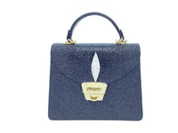 Женская сумка из натуральной кожи морского ската черного цвета. Для изготовления сумок данной модели используется натуральная кожа морского ската, кожа высокого качества выделки и окраса, крупнозернистая, эластичная и очень приятная на ощупь. В процессе окрашивания шкурок морского ската, центральная спинная часть шкурок была выделена белым цветом, в виде ромбовидных глазков белого цвета. Такой способ окрашивания кожи морского ската является классическим. Откидывающийся вверх лицевой клапан устроен на лицевой поверхности сумки, клапан выполнен из кожи морского ската, в центральной части лицевой поверхности клапан фиксируется на металлический замочек. В качестве дополнительного украшения сумки лицевой клапан украшен вертикальным белым глазком. В верхней части сумки вшита верхняя ручка. Ручка выполнена на основании из кожи теленка, верхняя часть ручки выполнена из кожи морского ската. Ручка крепится к сумке в верхней части, с применение специальной фурнитуры с металлическим кольцом для крепления съемного плечевого ремня. Обратная часть сумки выполнена с применением кожи морского ската, в качестве украшения обратной части сумки устроен горизонтальный белый глазок. На обратной стороне сумки устроен плоский карман на всю ширину сумки, доступ в этот плоский карман выполнен в верхней части сумки. Лицевая поверхность сумки под лицевым клапаном также выполнена из натуральной кожи морского ската. Боковые поверхности и дно сумки выполнены из натуральной кожи теленка, применение кожи теленка увеличивает эластичность боковых вставок сумки и дна. Плоским карманом на молнии сумка внутри разделена на два отделения. В одном из отделений устроен накладной карман на металлической молнии, во втором отделении устроен накладной объемный карман для мобильного телефона, ширина кармана для телефона – 15см. Съемный, с возможностью регулировки по длине плечевой ремень поставляется в комплекте с сумкой, плечевой ремень выполнен из кожи теленка, кожа теленка по цвету подобрана под цвет кожи морского ската. В качестве материала подклада в данной сумке используется натуральная кожа теленка и мягкий текстиль.