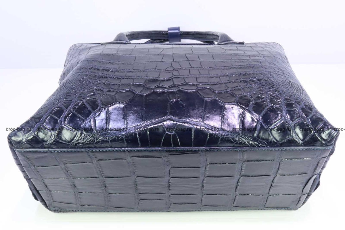 Удобная женская сумка формата А4 из натурального крокодилового брюха темно-синего цвета. Ширина-28см, высота-40см, толщина-10-11см. Сразу нужно обратить ваше внимание на то, что с крокодиловой сумкой данной модели не поставляется в комплекте плечевой ремень. Конструкцией сумки на предусмотрены D-образные кольца для крепления съемного плечевого ремня. Сумка данной модели носится в руке, на предплечье и в редких случаях на плече. Для пошива сумок данной модели используется натуральная кожа Сиамского крокодила, нежнейшая брюшная часть, крокодиловая кожа высокого качества выделки и окраса, кожа мягкая, упругая и очень приятная на ощупь. Все внешние поверхности сумки отшиты с применением кожи крокодила с брюшной или гладкой фактурой. Сумка трапециевидной формы с легким расширением в верхней части. На лицевой и обратной сторонах сумки, в верхней части выполнено крепление верхних ручек сумки, ручки сумки отшиты из натуральной кожи крокодила. В верхней части сумки вшита металлическая молния. Молния преграждает доступ в основной объем сумки. Сумка внутри выполнена в одном объеме, для удобства пользования сумкой внутри сумки расположены карманы для предметов первой необходимости, сдоенный боковой карман и боковой вшивной карман на молнии. В качестве материала подклада сумки используется натуральная мягкая телячья кожа. Цвет кожи теленка подобран под цвет крокодиловой кожи. Документы формата А4 и даже папки с документам размера А4 помещаются в данную сумку вертикально.