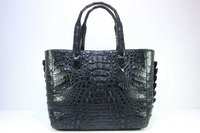 Женская сумка из натуральной фактурной крокодиловой кожи черного цвета. Для пошива сумок данной модели используется натуральная кожа крокодила фактурная спинная часть. Все внешние поверхности сумки выполнены из кожи крокодила. Лицевая часть сумки украшена крокодиловой кожей с фактурным затылком переходящая ниже в спинную фактуру. Обратная часть сумки выполнена из натуральной кожи крокодила с фактурной спинной частью. Дно сумки отшито из кожи крокодила со спинно-хвостовой фактурой. Боковые вставки сумки выполнены с применением хвостовой части крокодиловой кожи. Верхние ручки сумки выполнены брюшной части крокодиловой шкуры. Сумки данной модели не предусматривают в комплекте плечевого ремня, конструкция сумки не имеет D-образных колец для крепления плечевого ремня. Крокодиловые сумки данной модели можно носить в руке, на предплечье и реже на плече. В верхней части сумки вшита металлическая молния, молния выполнена с выпускным хвостиком, что позволяет более широко открыть сумку, молния преграждает доступ в основной объем сумки. Сумка внутри выполнена в одном объеме. Для повышения уровня удобства пользования сумкой, внутри устроены удобные карманы для повседневных предметов первой необходимости, боковой карман на молнии и сдвоенный накладной карман. Нежная кожа теленка используется в качестве материала подклада для данной сумки, кожа телёнка по цвету подобрана под кожу крокодила.