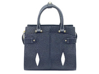 Новая серия женских сумок из натуральной кожи морского ската, сумка черного цвета. При производстве сумок данной модели использована натуральная, высококачественная кожа морского ската в количестве четырех шкурок морского ската, кожа крупнозернистая, приятная на ощупь, каждая из шкурок украшена вертикальным белым глазком. Лицевая и обратная поверхности сумки выполнены в натуральной коже морского ската, на каждой из этих сторон в качестве украшения расположено по два вертикальных белых глазка. В качестве дополнительного украшения сумки на лицевой поверхности, по краям, наверху сумки устроено по одному декоративному хлястику-ремешку. На лицевой и на обратной сторонах сумки устроено по одному удобному плоскому карману, доступ в карман фиксируется на металлическую магнитную кнопку. В верхней части сумки выполнены удобные ручки, расстояние от верха сумки до ручек 10см. Ручки выполнены из натуральной мягкой кожи теленка, ручки округлой формы и очень приятно ложатся в руку, ручки оборудованы специальным колечком для соединения ручек между собой. Крепление ручек к сумке выполнено с применением красивой металлической фурнитуры золотого цвета. В верхней части сумки вшита металлическая молния золотого цвета. Молния вшита в сумку с выпусками на каждую из сторон сумки, выпуски молнии крепятся к сумке на магнитные кнопки. Такие выпуски молнии в стороны позволяют, при полностью открытой молнии, получить более удобный и широкий доступ внутрь сумки и как следствие с большим удобством и комфортом убрать что-то в сумку или достать что-то объемное из сумки. В верхней части сумки, справа и слева от металлической молнии устроены металлические кольца золотого цвета D-образной формы, кольца для крепления съемного плечевого ремня. Боковые поверхности сумки отшиты с применением натуральной кожи теленка подобранной по цвету под кожу морского ската. Дно сумки также выполнено с применением кожи теленка, для повешения уровня удобства пользования данной сумкой, на дне сумки устроены четыре металлических ножки золотого цвета. Съемный, регулируемый по длине плечевой ремень из натуральной кожи теленка поставляется в комплекте с сумкой. Плоский карман на молнии весьма относительно делит внутренний объем сумки на две части, крепление данного кармана выполнено только в верхней его части, в нижней части карман не фиксируется внутри сумки. Для большего комфорта пользованием данной сумки внутри устроены дополнительные карманы, боковой на молнии и на противоположной стороне двойной накладной карман. Один из накладных карманов плоский, второй объемный предназначен для телефона. В качестве дополнительного украшения сумки, внутри сумки выполнены вставки из кожи теленка, вставка вокруг кармана на молнии, и вставка, окаймляющая верхнюю часть двоенного накладного кармана. В качестве материала подклада сумки применена ткань, подобранная по цвету под цвет кожи морского ската, использование ткани в качестве подкладочного материала снижает вес сумки. Данная сумка из кожи морского ската является новинкой и отшивается в четырех цветах, в черном, красном, винном и темно-зеленом.