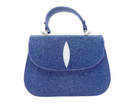 Женская сумка из натуральной кожи морского ската темно-синего цвета. Для изготовления сумок данной модели используется натуральная кожа морского ската, кожа крупнозернистая и эластичная высокого качества выделки и окраса. На лицевой части сумки, в верхней части устроен откидывающийся вверх лицевой клапан, клапан сумки украшен белым ромбообразным вертикальным глазком. Лицевая поверхность сумки под лицевым клапаном выполнена с применением натуральной кожи морского ската. Лицевой клапан фиксируется на металлическую магнитную кнопку, расположенную в нижней части внутри клапана, и ответная часть расположена на лицевой части сумки. В верхней части сумки вшита удобная ручка. Ручка выполнена на основании из кожи теленка, верхняя часть ручки украшена натуральной кожей морского ската. На обратной части сумки выполнен плоский карман с доступом в верхней части, также обратная часть сумки выполнена из кожи морского ската. Для придания сумке большей эластичности боковые вставки сумки выполнены с применением кожи теленка темно-синего цвета. В верхней части сумки, слева и справа, в местах крепления верхней ручки устроены металлические кольца для крепления съемного плечевого ремня. Съемный, с возможностью регулировки по длине плечевой ремень поставляется в комплекте с сумкой. Плечевой ремень выполнен из натуральной кожи теленка темно-синего цвета. Внутри сумка выполнена в одном объеме, для дополнительного удобства пользования внутри сумки выполнены удобные карманы, объемный накладной для мобильного телефона, ширина кармана 14см и боковой карман на молнии. В качестве материала подклада используется текстиль и натуральная кожа теленка темно-синего цвета.