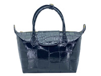 Фабрика отшила новую серию бюджетных женских сумок из натуральной кожи сиамского крокодила. Женская крокодиловая сумка черного цвета. Для изготовления сумок данной модели используется натуральная кожа сиамского крокодила, кожа эластичная и очень приятная на ощупь. Сумка классической формы в виде перевернутой трапеции с расширением к верхней части. Все наружные поверхности сумки такие как: лицевая и обратная часть сумки, верхние ручки и дно сумки исполнены в коже крокодила. В верхней части сумки вшита металлическая молния золотого цвета. Слева и справа, в верху молнии устроены люверсы для крепления съемного плечевого ремня. Верхние ручки сумки отшиты из кожи крокодила и выполнены в круглой форме которая очень приятно и удобно ложится в руку. Расстояние от верха сумки до ручек – 10см, что позволяет носить данную сумку даже на предплечье. На дне сумки устроены 4 металлические ножки золотого цвета. Внутри сумка выполнена в одном объеме, в качестве материала подклада используется кожа теленка, подобранная под цвет кожи крокодила. Для повышения удобства пользования данной крокодиловой сумкой внутри сумки устроены карманы – вшивной боковой на молнии и сдвоенный накладной карман. Съемный плечевой ремень, с возможностью регулировки по длине поставляется в комплекте с сумкой. Плечевой ремень отшит из натуральной кожи теленка и верхняя часть ремня имеет отделку из крокодиловой кожи. Крокодиловые сумки данной модели отшиты этой фабрикой в первый раз, они получились довольно бюджетными, сумки изготовлены в пяти различных цветах: в красном, черном, сером, коньячном и гималаи. Данные женские крокодиловые сумки не имеют определенной лицевой и обратной стороны, данными сумками с одинаковым удобством могут пользоваться как левши, так и правши. Эти сумки из крокодиловой кожи приглянуться тем из вас кто отдает предпочтение сумкам среднего размера, которые можно носить как в руке, так и на плече.