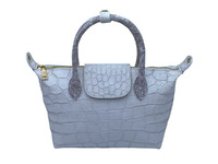 Фабрика отшила новую серию бюджетных женских сумок из натуральной кожи сиамского крокодила. Женская крокодиловая сумка цвета гималаи. Для изготовления сумок данной модели используется натуральная кожа сиамского крокодила, кожа эластичная и очень приятная на ощупь. Сумка классической формы в виде перевернутой трапеции с расширением к верхней части. Все наружные поверхности сумки такие как: лицевая и обратная часть сумки, верхние ручки и дно сумки исполнены в коже крокодила. В верхней части сумки вшита металлическая молния золотого цвета. Слева и справа, в верху молнии устроены люверсы для крепления съемного плечевого ремня. Верхние ручки сумки отшиты из кожи крокодила и выполнены в круглой форме которая очень приятно и удобно ложится в руку. Расстояние от верха сумки до ручек – 10см, что позволяет носить данную сумку даже на предплечье. На дне сумки устроены 4 металлические ножки золотого цвета. Внутри сумка выполнена в одном объеме, в качестве материала подклада используется кожа теленка, подобранная под цвет кожи крокодила. Для повышения удобства пользования данной крокодиловой сумкой внутри сумки устроены карманы – вшивной боковой на молнии и сдвоенный накладной карман. Съемный плечевой ремень, с возможностью регулировки по длине поставляется в комплекте с сумкой. Плечевой ремень отшит из натуральной кожи теленка и верхняя часть ремня имеет отделку из крокодиловой кожи. Крокодиловые сумки данной модели отшиты этой фабрикой в первый раз, они получились довольно бюджетными, сумки изготовлены в пяти различных цветах: в красном, черном, сером, коньячном и гималаи. Данные женские крокодиловые сумки не имеют определенной лицевой и обратной стороны, данными сумками с одинаковым удобством могут пользоваться как левши, так и правши. Эти сумки из крокодиловой кожи приглянуться тем из вас кто отдает предпочтение сумкам среднего размера, которые можно носить как в руке, так и на плече.
