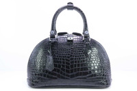 Сумка женская из натуральной кожи крокодила, сумка в стиле Louis vuitton Alma цвет черный. Ширина-31см, высота-20см, толщина-13см. Для пошива сумок данной модели используется натуральная кожа сиамского крокодила, нежнейшая брюшная часть, крокодиловая кожа высокого качества выделки и окраса. Все внешние поверхности сумки такие как лицевая и обратная сторона, дно и верхние ручки, все это выполнено в натуральном крокодиловом брюхе. Сумка округлой формы, в верхней части сумки вшиты удобные высокие ручки, крепление ручек сумки выполнено с применением металлических колец прямоугольной формы. К одной из ручек сумку прикреплен декоративный шнурок из крокодиловой кожи с ключиком от декоративного замка. В верхней части сумки вшита металлическая двухсторонняя молния с декоративным замочком, украшенным кожей крокодила. Применение двухсторонней молнии и отсутствие ярко выраженной лицевой части сумки позволяет с одинаковым удобством пользоваться данной сумкой как правшам, так м левшам. Молния вшита по всей окружности сумки, что позволяет более широко открыть сумку. Верхние ручки сумки выполнены из крокодиловой кожи и имеют достаточную высоту чтобы данную сумку можно было носить как в руках, так и на предплечье. На дне сумки устроены металлические ножки. В комплекте с сумкой поставляется съемный плечевой ремень, плечевой ремень имеет возможность регулировки по длине, ремень отшит на основании из кожи теленка, верхняя часть лицевого ремня выполнена в коже крокодила. Сумка внутри выполнена в одном объёме, для удобства пользования сумкой внутри устроены карманы для предметов первой необходимости, боковой накладной и боковой на молнии. В качестве материала подклада используется натуральная мягкая телячья кожа, кожа телека по цвету подобрана под цвет наружной кожи крокодила.